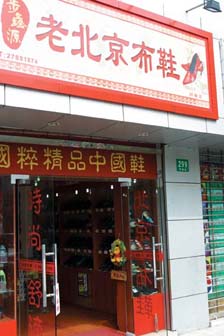 虽说步鑫源老北京布鞋店面积不大,但是却有一块十分醒目的招牌。与其他店铺招牌主打品牌名称不同,这里突出的是产品内容: “老北京布鞋”的字样格外醒目。