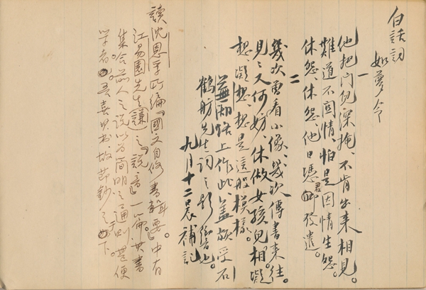 他对此十分得意,自诩为一大创举。可惜这些得意之作在排印熬中则有不少阙如。另外,手稿本还有一些写后又被删去之处,如手稿第14册第1页,有打油诗《怀君武先生》一首,亚东版和胡适诗集均未收录。“八年不见马君武,见时蓄须犹未黑。自言归去作工人,今在京城当政客。”诗后题:“看报作此。六年三月廿一日”。应是亚东版整理时,马君武(1881—1940,国民党元老级人物)不仅在世,且为颇有影响之政治人物,而胡适当年报考中国公学时,监考官即为总教习马君武,为胡适师长,故特意删去。