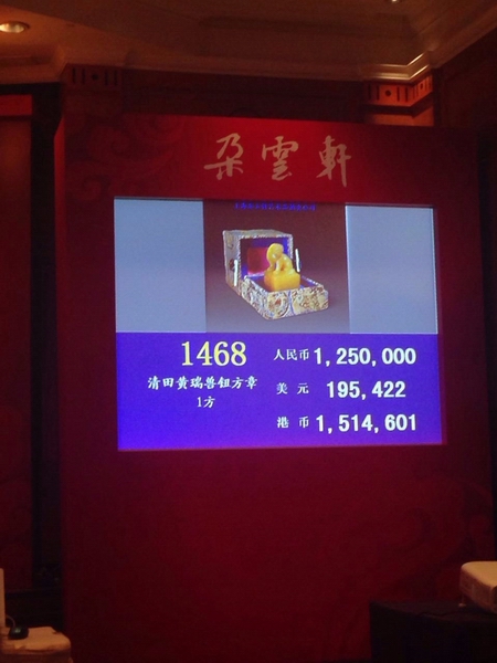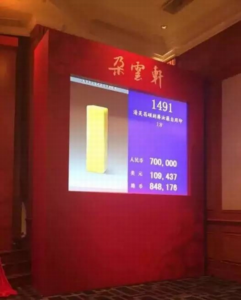 下午2点开拍的“金石缘—近现代名家篆刻专场”共有191件上拍拍品,其中本专场图录封面作品“田黄瑞兽钮方章”以120万元起拍,125万元落锤,加佣金后,成交价为143万。此方田黄重66克,平均每克价格超2万元,几乎百倍于黄金!是为本场冠军拍品。