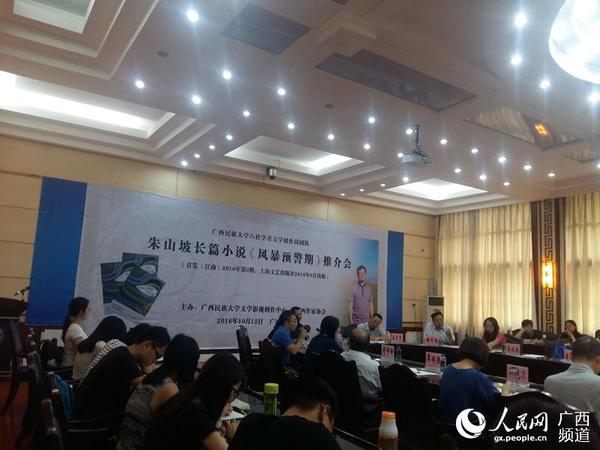 广西民族大学副校长、评论家黄晓娟说,我们学校的八桂学者文学创作岗汇聚了最优秀的一批作家,他们组成了相思湖作家群最亮丽的名片。今天,我们在这里举行70后作家朱山坡长篇小说《风暴预警期》的推介会,这是八桂学者文学创作岗又一精彩的成果收获。