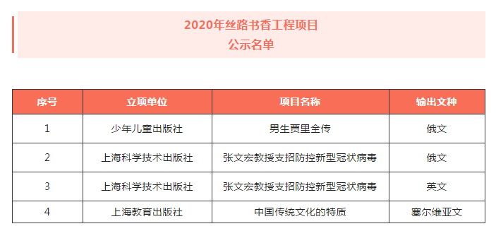 近日,丝路书香工程办公室公布2020年丝路书香工程项目公示名单。2020年4月,丝路书香工程办公室启动本年度项目申报工作。在对项目版权归属、申报要件等审核,组织专家初评、复评和终评,并对内容审核把关基础上,确定131家出版机构308种图书为本年度资助项目。其中,上海世纪出版集团上海科学技术出版社2种入选,少年儿童出版社和上海教育出版社各1种入选。