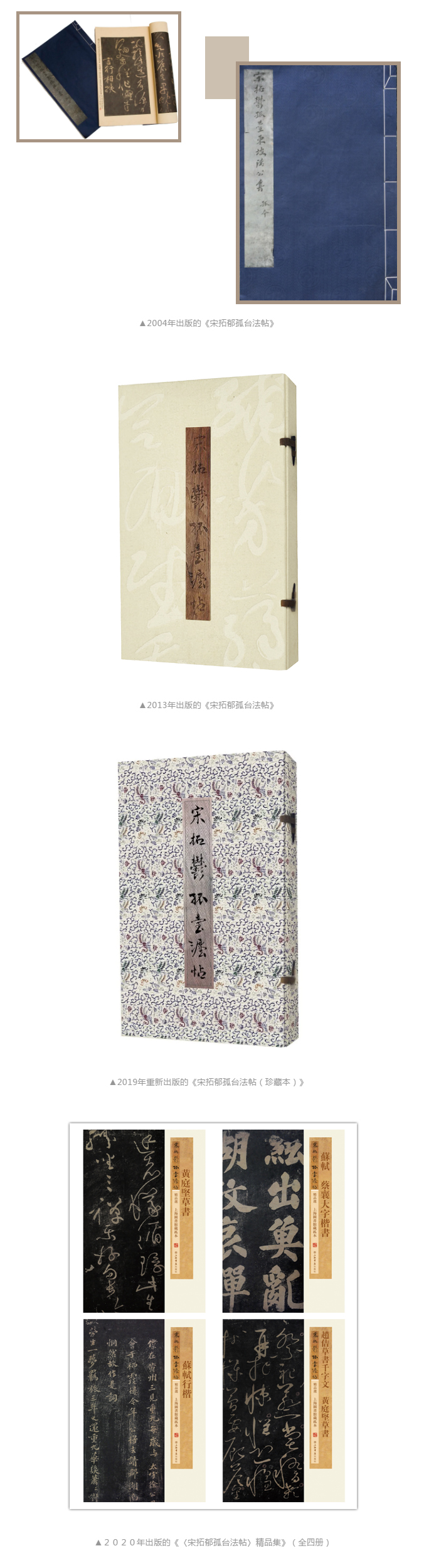 《宋拓郁孤台法帖(珍藏本)》由上海书店出版社于2019年新装出版,再次将这一珍贵的书坛瑰宝呈现于世。此书完全按照上海图书馆馆藏《郁孤台法帖》孤本原帖的分册与尺寸制作出版,依原样作精装宣纸彩色影印而成,极致还原了原帖的气韵风貌,具有很高的研究和收藏价值。