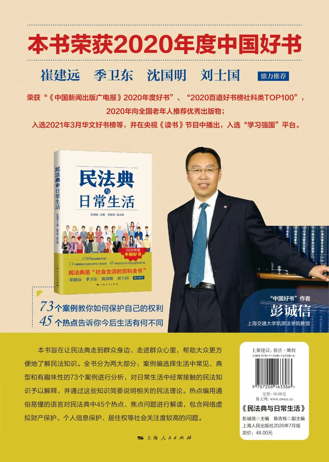 日前,上海交通大学凯原法学院彭诚信教授主编的《民法典与日常生活》荣获2020年度“中国好书”。本书旨在让民法典走到群众身边、走进群众心里,帮助大众更方便地了解民法知识。