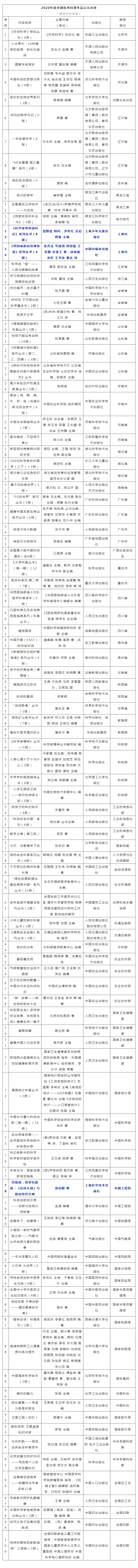 关于2020年全国优秀科普作品名单公示的通知 根据《科技部办公厅关于推荐2020年全国优秀科普作品的通知》(国科办才〔2021〕58号),科技部组织开展了2020年度全国优秀科普作品推荐活动,各地方、部门共推荐434册(套)作品,经形式审查、专家评审,评选出2020年全国优秀科普作品100册(套)(见附件),现将《环球科学新知丛书》等100部作品予以公示。