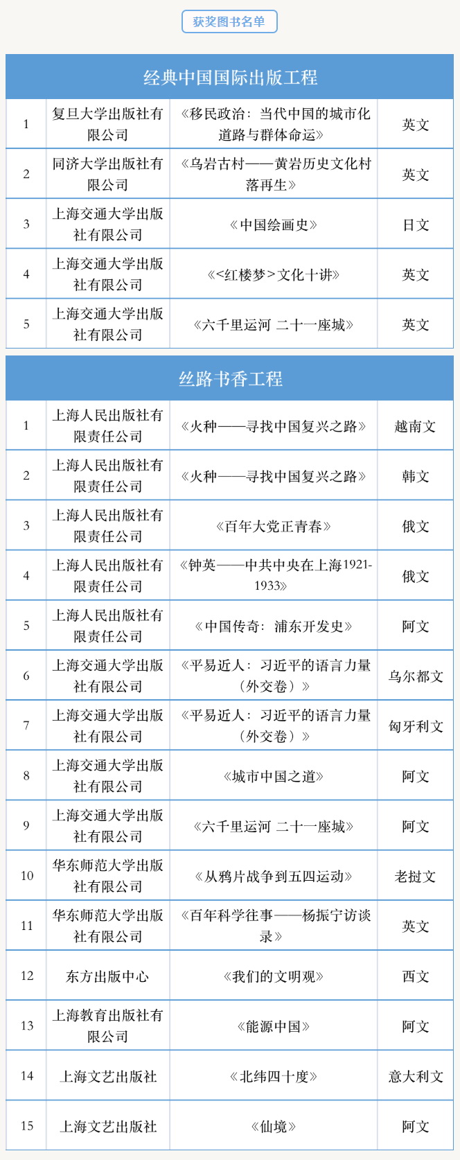 近日,经典中国国际出版工程办公室、丝路书香工程办公室分别发布了2022年“经典中国国际出版工程”和“丝路书香工程”公示名单。上海地区出版社5个项目入选2022年“经典中国国际出版工程”,15个项目入选2022年“丝路书香工程”。