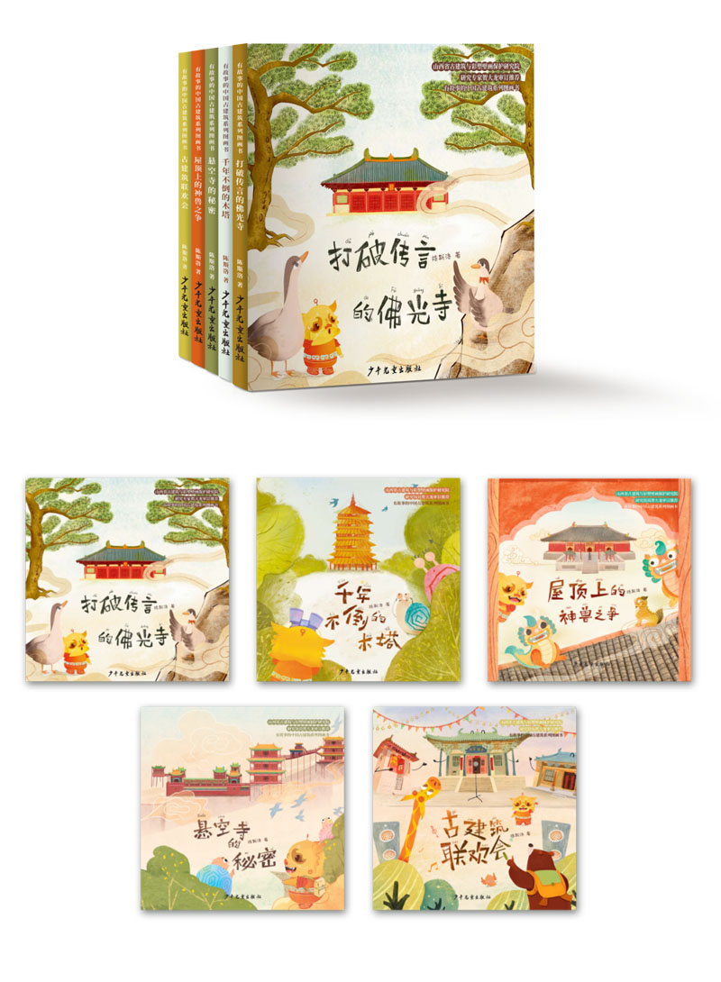 在《有故事的中国古建筑系列图画书》里,陈斯洛和《鉴赏课》团队与山西华旅文化进行深入合作,他们用超过两年的时间实地走访、拍摄、设计、思考,以小朋友的趣味插图为原型,基于三维模型数据进行绘制,由多位古建筑文化研究专家担纲顾问,保证了趣味性、专业性、知识性的融合,把中国五座最具代表性的中国古代木构建筑背后的故事一一为读者道来。