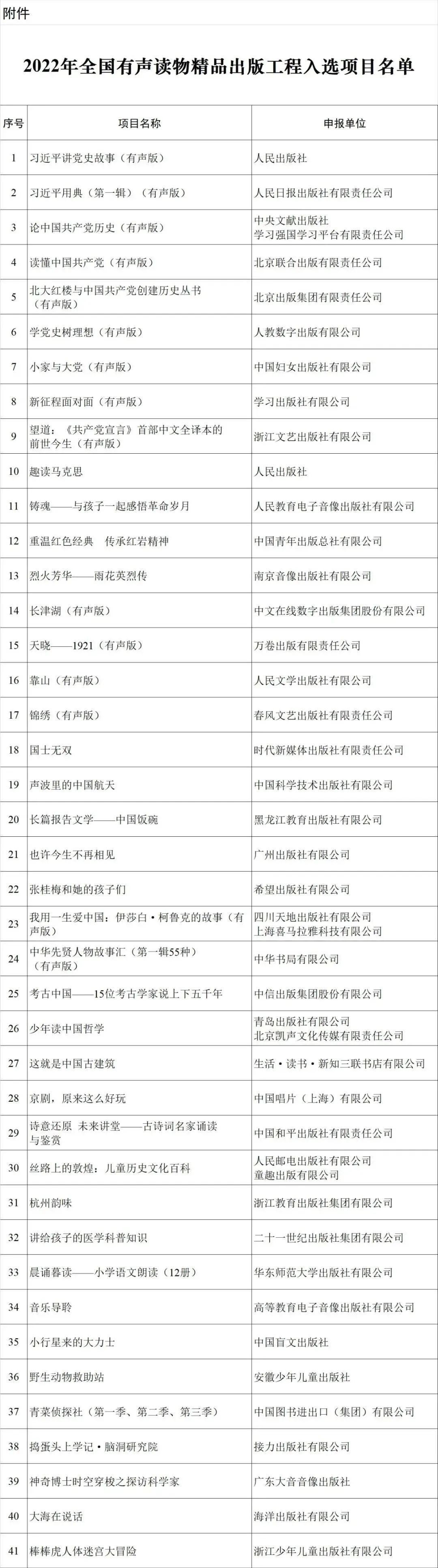 ★ ★ ★ ★ ★ 根据《国家新闻出版署关于开展2022年全国有声读物精品出版工程项目申报工作的通知》(国新出电〔2022〕21号),经工程评审办公室组织专家严格评审遴选,拟确定人民出版社《习近平讲党史故事(有声版)》等41个项目入选。现将名单进行公示,公示期为2022年11月16日至11月20日。如有不同意见,可在公示期内向工程评审办公室进行反映。