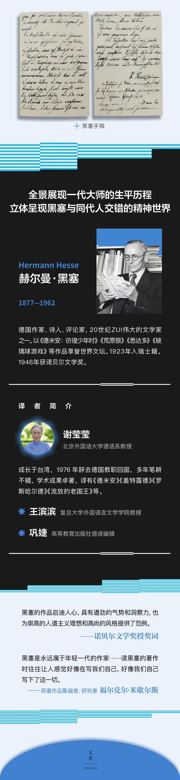 《黑塞书信集》囊括了黑塞的一生。译者从黑塞长达70年的书信中挑选了有代表性的(278封)信件,主要包括黑塞个人的成长与发展,家庭与思想的变化,追求、奋斗、创作的历程,与父母、妻儿、姐妹的日常信件,参加社会公共活动,与同时代大家如茨威格、罗曼·罗兰、托马斯·曼等人的交往,对个体与集体、写作、文学、时事、战争、社会的观察和见解等,汇聚了黑塞的思想闪光和人格魅力。 这些书信见证了黑塞从少年到老年的生平与经历,记录了他如何在创作道路上不断突破自我,成为一代大师,同时立体呈现了黑塞与同代人交错的精神世界,展示出半个多世纪历史交替与文化变迁的轨迹。 对中国读者来说尤为亲切的是,在目睹两次世界大战带来的深重灾难之后,黑塞将东方文化视作人类精神困境的出路,他真诚推崇中国文化,在书信中表达了对中国文化的独特理解。 本书选编者、译者之一,北京外国语大学德语系教授谢莹莹与黑塞结缘颇深。自青年时代起,谢莹莹教授就喜爱黑塞,研究黑塞。不幸的是,1990年,她身患脊髓恶性肿瘤,手术后卧病多年,但她仍凭借坚强的毅力重新投入教学和研究工作,培养了一代代优秀学子,翻译了多部黑塞作品。黑塞也为她带来了生命的火花,“当我困于病榻阅读他的书信时,仿佛一位老友在耳畔娓娓诉说生命的真义,为我的心灵带来无限慰藉”。从某种程度上说,译者不仅用文字,也用生命经验为读者重现了黑塞思想的精华。图书信息《黑塞书信集》 [德] 赫尔曼·黑塞 著谢莹莹 王滨滨 巩婕 译定价:79元上海人民出版社·文景 ☆ 人人都爱黑塞!全球青年的心灵挚友,永远属于年轻一代的诺贝尔文学奖得主 ☆ “不要随波逐流,我们在世间最重要的事是成为自己!”聆听黑塞,成为自己 ☆ 278封书信中文版重磅呈现,全景展现一代大师的生平历程和精神蜕变 ☆ 经历三次婚姻、克服创作危机、穷困潦倒时还不忘救济朋友、失去祖国……关于黑塞的一切细节都在这里 ☆ 了解黑塞的中国情缘:倾心禅宗,热爱中国文化,对傅聪的音乐才华赞赏有加 作者简介 赫尔曼·黑塞(Hermann Hesse,1877—1962),德国作家、诗人、评论家,20世纪伟大的文学家之一。以《德米安:彷徨少年时》《荒原狼》《悉达多》《玻璃球游戏》等作品享誉世界文坛。1923年入瑞士籍。1946年获诺贝尔文学奖。