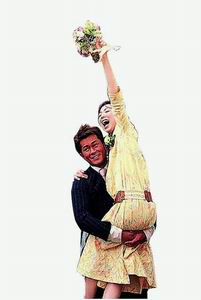 斗气招数四:抱起 先前只是牵手两人便已经如此,万一遇到激情亲热戏可怎么办?而另一场“古天乐抱起郑秀文”的戏在拍摄中困难似乎更大了。这场戏说的是“Sammi出席前男友婚礼时,被花球掷中,现任男友古天乐乘机向她求婚,更兴奋到一把将Sammi抱起”。虽然Sammi是出名的“瘦骨嶙峋”,体重只有一百磅,但不知道是她有心还是无意,每次古仔一抱起她时,她都忍不住要大笑,弄得导演只能不停地NG。在抱到第7次时,古天乐的力气就似乎耗尽,抱到一半时就泄气撒手;而当NG到20次时,古仔已经累得手脚发软,到最后更是努力使出九牛二虎之力才能将Sammi抱起。之后古天乐不住地抱怨:“看你长得那么瘦,原来那么沉!”