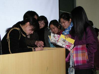 |||F color=#0000FF (12月17日下午2点,林资敏女士在华东师范大学田家炳楼114举行了名为“抓住粉丝-左脑右脑玩一玩”的视觉行销讲座,同时还进行了相关的签售活动,