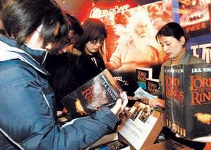 “七本套装是电影版,四本套装是美国版……”昨天在大华影院,姜涛忙不迭地向一群围观者解释英文《指环王》图书不同版本间的区别。与此同时,他身边的“指环王戒指”、“指环王扑克”以每分钟俩的平均速度,被观众抢购一空。