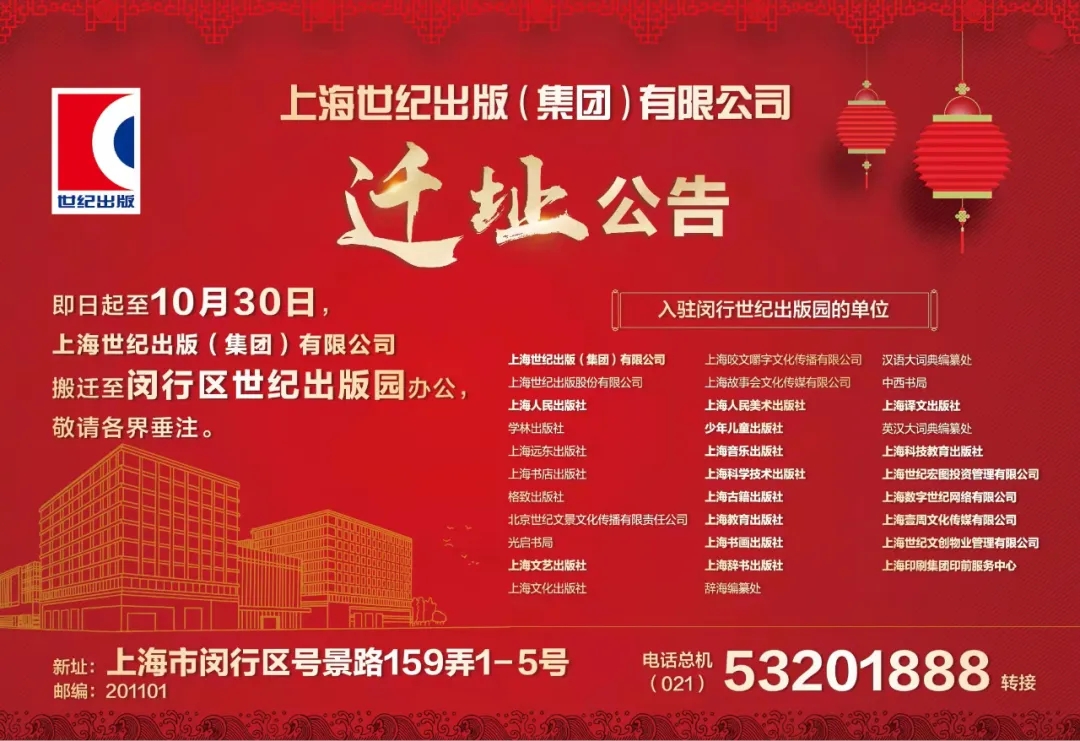 上海世纪出版(集团)有限公司于2021年9月23日起正式迁入位于闵行七宝的世纪出版园新址办公。