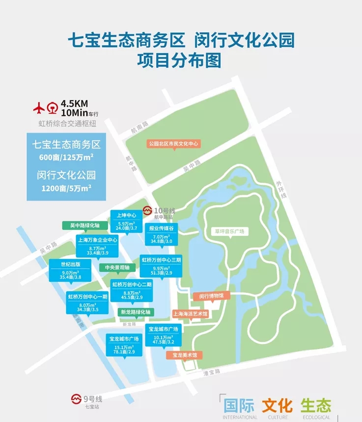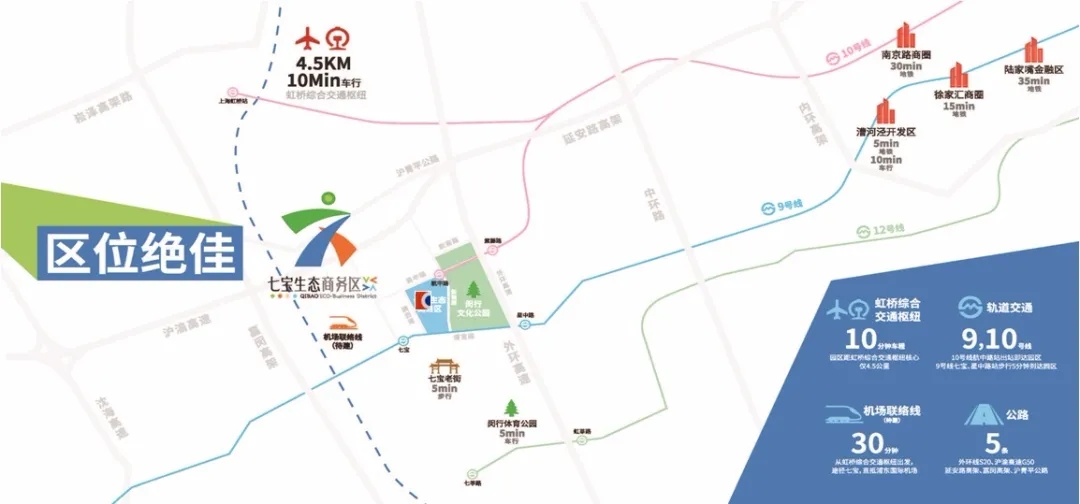 根据国务院批准的《虹桥国际开放枢纽建设总体方案》“一核两带”发展格局,七宝部分处于“一核”。七宝生态商务区是上海市25个现代服务业集聚区之一,其总建筑体量达125万平方米。作为西进上海的必经门户,衔接虹桥商务枢纽及进博会外溢效应,依托长三角一体化发展战略,正致力于打造以文化创意产业为特色的国际化生态商务园区。