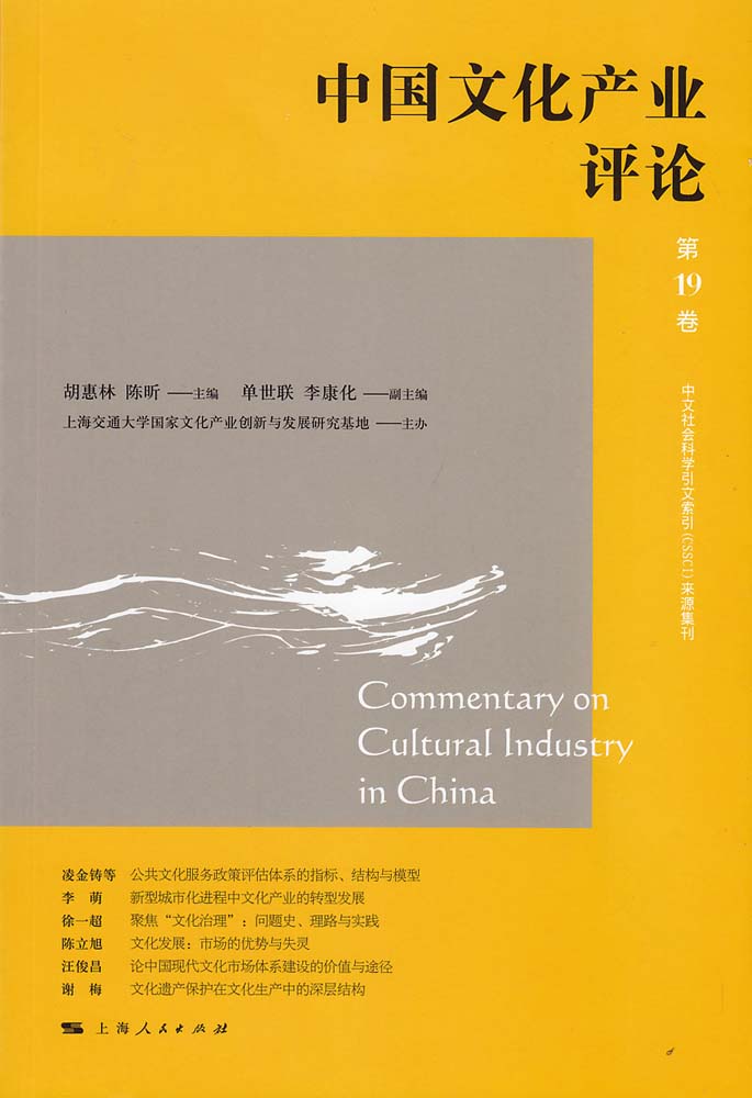 理论探讨 文化全球化VS文化帝国主义:文化产业的视角 产品、符号、精神生产与品牌价值传播 ——以“维多利亚的秘密”为例 文化资本对于经济增长的作用机理 ——基于VIP框架的中国考察 区域文化产业竞争力决定要素及指标体系研究 公共文化服务政策评估体系的指标、结构与模型新型城镇化与文化发展转型 新型城市化进程中文化产业的转型发展 城镇化进程中中国文化产业发展的三对主要矛盾 新型城镇化的文“化”之道 城镇化进程中文化遗产的价值效用文化治理 聚焦“文化治理”:问题史、理路与实践 以文化体制改革优化政府供给 推进国家治理能力现代化 ——基于执政能力函数的分析 合作治理视角下中国文化产业发展的治理范式:作为社会治理的文化治理建立健全现代文化市场体系 文化发展:市场的优势与失灵 论中国现代文化市场体系建设的价值与途径 论制度变革与我国文化产业发展不平衡的辩证统一 ——以建立健全现代文化市场体系为视点 “理顺关系”的关键在于推进主管主办制度向出资人制度过渡文化经济 我国电影产业财税扶持政策绩效 ——一个国际竞争优势培育视角的考察 文化遗产保护在文化生产中的深层结构 我国影视作品版权资产证券化融资问题研究 文化创意产业集群“创意打包贷”融资新模式的构建文化消费 以乐为本:文化产品消费属性的规范研究 上海市民文化消费现状及培育与建设路径 ——以上海市闵行区为视点 2012台北市民文化素养调查文化产业示范基地 国家文化产业示范基地十年发展历程研究 走向悖谬的“典型示范”发展方式论坛综述 面向中国未来寻找转型动力 ——第四届全国文化产业青年学者论坛综述编后记约稿启事