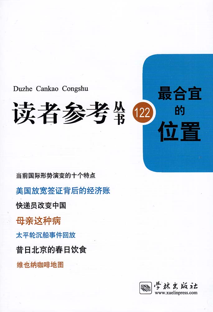 读者参考丛书编辑部编著的《最合宜的位置》是以多层次读者为对象的综合性文摘读物,在一定读者群内有一定知晓度,较多关注国际国内热点,社会经济民生,教育文化体育,兼顾家庭婚恋健康等多方面内容,遴选有层次,知识丰富,可读性强,属高端文摘类读本。信息密集,知识丰富,新见纷呈,是广大读者通晓天下大事、把握时代脉搏、充实文化知识、提高生活情趣的休闲赏阅的佳品。