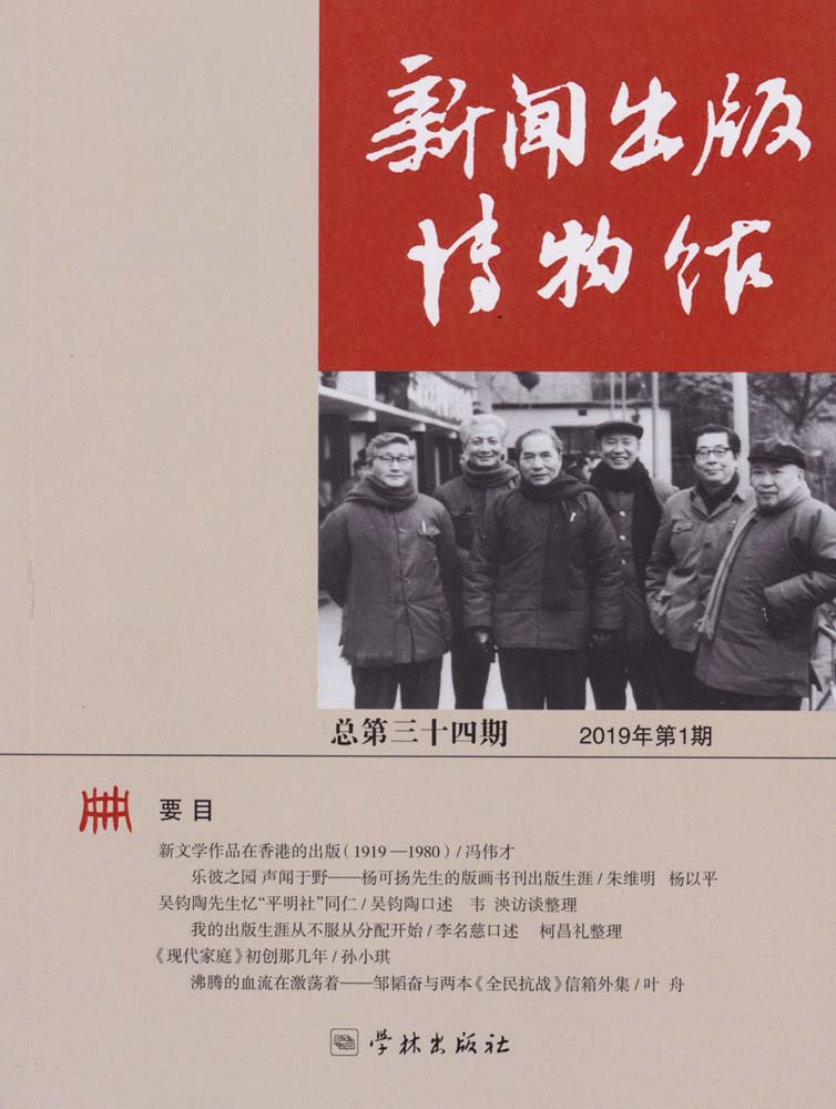 卷首 文洁若女士捐赠翻译手稿/王京芳书业史话新文学作品在香港的出版(1919—1980)/冯伟才从中学教科书到清史名著—汪荣宝《清史讲义》版本变迁/柳和城晓星书店/陈克希书报故人乐彼之园 声闻于野—杨可扬先生的版画书刊出版生涯/朱维明 杨以平父亲的文人朋友 / 王小平口述历史吴钧陶先生忆“平明社”同仁/吴钧陶口述 韦泱访谈整理我的出版生涯从不服从分配开始/李名慈口述 柯昌礼整理为了迎接上海解放毛泽东著作单行本的紧急印刷发行/吉少甫口述 晓蓉整理采访手记北京南苑:风生水起(续一)—“两弹一星”采访手记/郑重书林刊苑《现代家庭》初创那几年/孙小琪沸腾的血流在激荡着—邹韬奋与两本《全民抗战》信箱外集/叶舟史实证考《亦报》“打油诗高手”本名考/祝淳翔知音飞鸿关于严复释文的考释 / 俞子林对《巴金与现代文学丛书》的一些补正/吴念圣馆藏赏阅《解放画集——上海解放一周年纪念》/陈韻