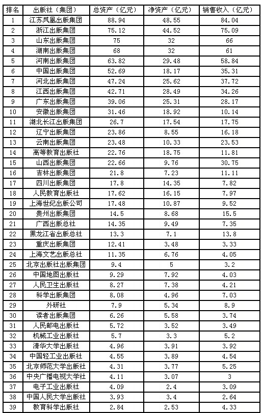 表1 出版集团及大社名社总资产、净资产及销售收入情况 (按总资产规模排序)