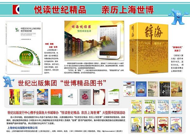 2010年4月20日,中国图书商报在第10版以半个版面的篇幅,并于4月23日在成都举行的第20届全国图书交易博览会广泛发行宣传,受到各方关注。该版面专门介绍了上海世纪出版集团出版发行的《中国2010年上海世博会官方导览手册》、辞海悦读器、《辞海》(第六版)缩印熬以及世纪出版集团出版的一系列”世博精品图书,世纪出版发行中心在全国各大城市举办的“悦读世纪精品,亲历上海世博”大型图书促销活动。
