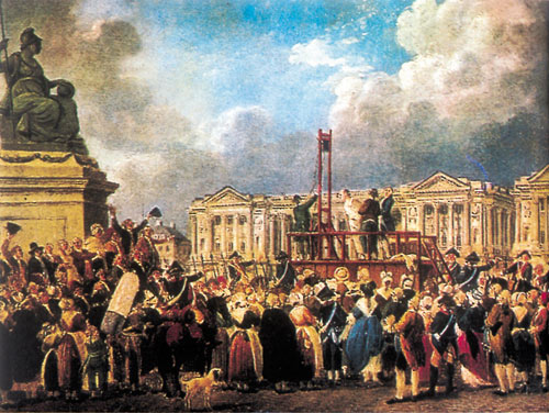 1793年1月21日,天空下着雨,但是,在巴黎革命广场的四周,却挤满了各色各样的人,这些人都很激动。他们一边热烈地议论着,一边翘首向远处的路上眺望。不久,一队士兵押着一辆马车缓缓走来。到了广场,4个士兵从车上押下一个人来,押他走上断头台,这时,群众中又爆发出一阵愤怒的呼声:“绞死他!”“割下他的头!”