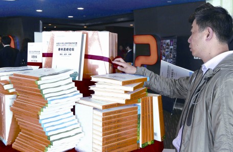 在上海世博会开幕一周年来临之际,由中国出版集团出版的世博论坛文集,由新华社编撰、上海人民出版社出版的《永远的世博会——中国2010年上海世博会典藏》等世博主题图书陆续推出,再掀购书热潮。 图为4月29日在世博文化中心,来自世博论坛举办城市的代表在观看世博论坛文集。