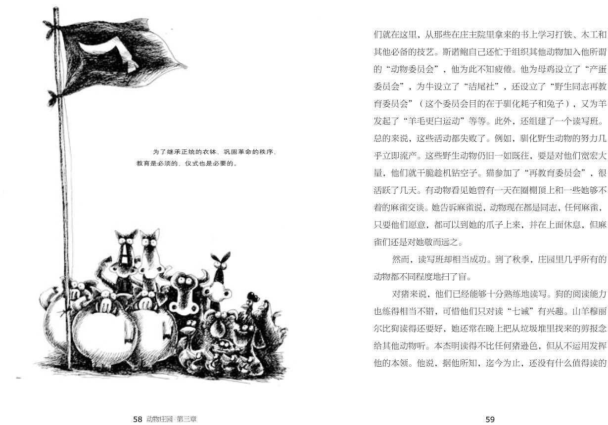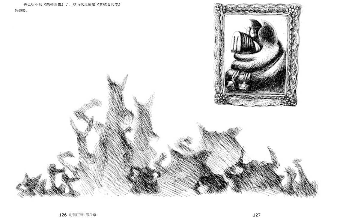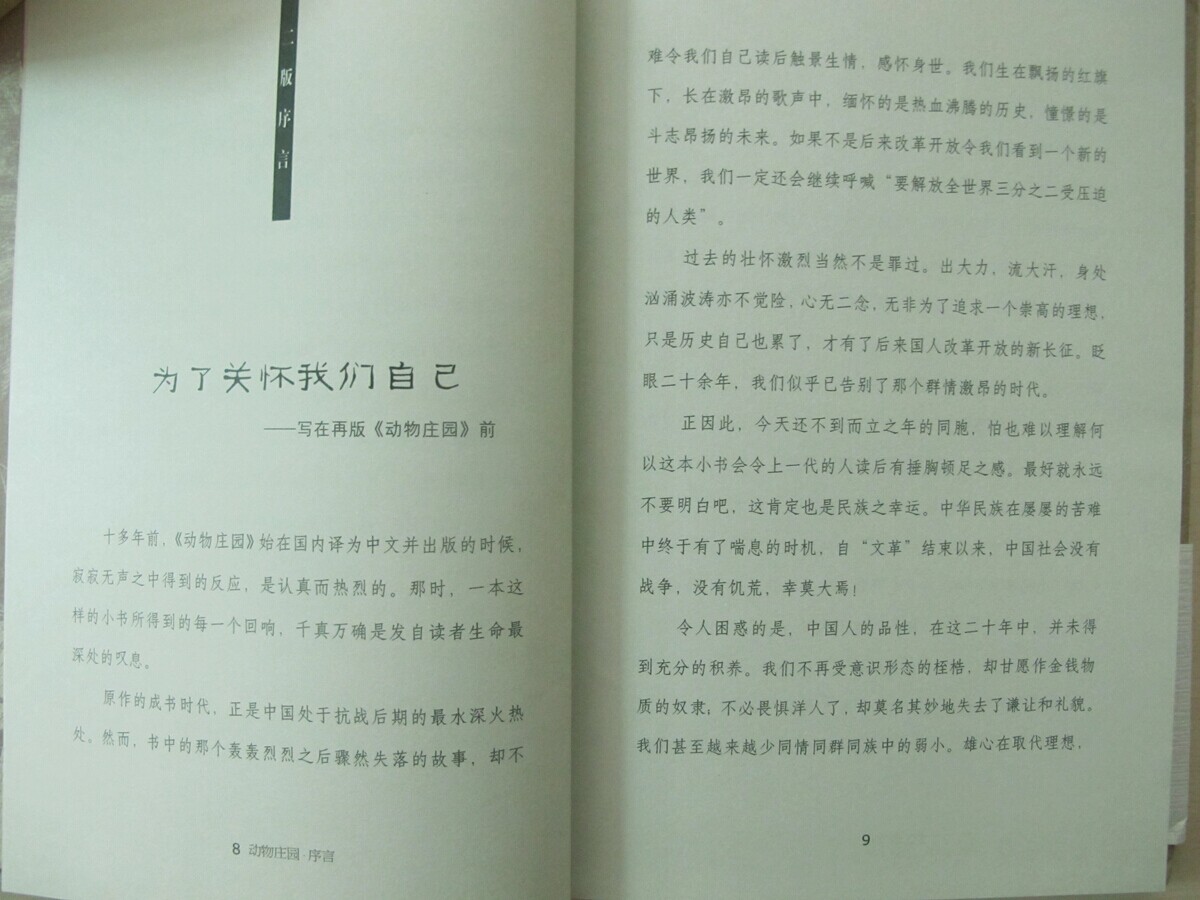 《动物庄园》立体书封 作为乔治·奥威尔七十周年的一个纪念,出版一个珍藏纪念版是我一直想做的一件事。 26年前,它是1949年之后大陆最早的一个中译本,现在我们要做的事是让它成为中国最好的一个中译本。 好,不仅仅指内容和译文,还包括形式。 如何体现? 几乎是在确定出版这个纪念版的同时,装帧的匹配性就是我们思考的重点。匹配,既是与书的内容的匹配,同时也是与纪念版的含义匹配。经过与设计师多次的方案探讨,目前这个版本的设计理念和制作是这样的: 精装封面的木质质感上凹凸有致地深深刻着年轮,象征着曾经的岁月和永恒的记忆,历史的风风雨雨荡涤的是浮尘,而经典终将愈久弥新。年轮暗合着纪念,彩烙纸的特性使得热烙部分呈现出深色和凹下去的感觉,正好与年轮的纹理和触觉匹配。 白色的涂鸦般随意书写又充满夸张和力量的英文书名让人感觉街头革命的气势,与咖啡色前后环衬上的漫画涂鸦手法互相呼应,让人回忆起不久前人类历史上最大的一场波普运动残留的痕迹。但印刷的局限使得白色无法很好地体现,经过前前后后多次试验,终于找到了粉批这样一种工艺,使得那种狂飙式的书写得以体现。也是对过去曾经历史的某种纪念和反省。 黑色烫金的中文书名在热烈激情的英文书名反衬下显得简朴。是啊,真理本来就是朴素的,再漂亮的辞藻再鼓噪的宣传机器虽然可能流行一时,但终究是会被打回原形的。 有趣的是,整个封面运用了多种工艺:年轮的凹凸是用了热烙工艺,白色的涂鸦用的是粉批工艺,而黑色的书名用的则是烫金工艺,唯独没有使用惯常的印刷术。这是不是也暗合了某种“珍藏”的理念呢? 当然最有看点的还是漫画。30幅钢笔插图无论从立意、还是造型,都颇为传神地表达了原著中蕴含的冷峻、夸张、讽刺、幽默、心酸和内里依然深藏的热情和对理想的向往。 这在《动物庄园》所有版本中恐怕是独一无二的。 许多细节设计也颇具匠心: 咖啡色的环衬与封面的木纹颜色是协调的。 前言后记的淡绿色衬托出的某种雅致和正文的波普风格则是对照的 一根黑丝线在实用功能外,是不是也是对某种轰轰烈烈大潮退潮或者变异后的殇呢? 而前言后记与正文的分色切割恰到好处,这肯定不是出于巧合。 也有遗憾:腰封的尺寸计算有误,使得腰封文字的接口对准了封面就对不准书脊,对准了书脊就使得与封面的文字错位了。那就只有留待重印时改正了。 遗憾难免,但当切切实实触摸到实体书时,我还是切切实实地感到了一个书人的欣慰。我可以对奥威尔和他的读者这样说:我做了一本匹配得上原著并且让自己满意的好书。《动物庄园》(插图珍藏纪念版)乔治·奥威尔著,张毅、高孝先译,赵为群插图和设计
