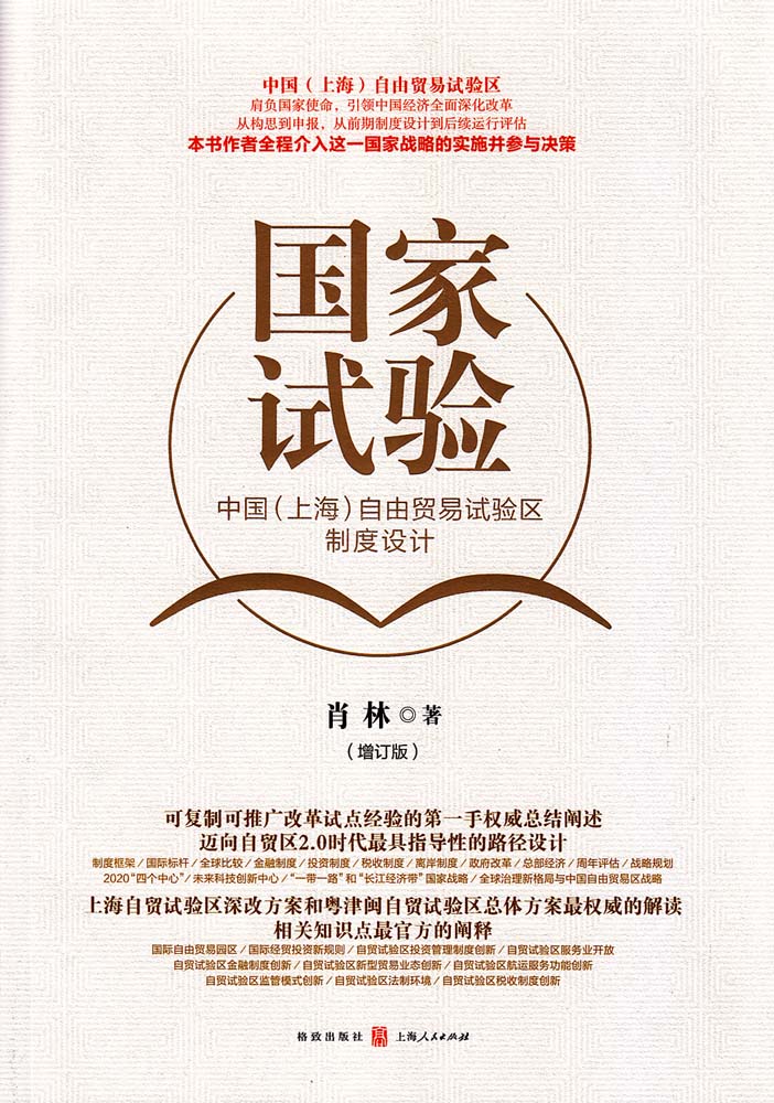 此外,由上海市政府发展研究中心主任肖林所著的《国家试验--中国(上海)自由贸易试验区制度设计(增订版)》也由施普林格出版英文版,向全球读者解读中国自由贸易区的相关政策。该书作者曾于2014年11月率团访美,与美中贸易全国委员会、美国贸易谈判代表、美国国会研究中心、布鲁金斯学会、美国著名跨国公司等美国政界、智库、企业界的专家进行专题交流和研讨,在美国南加州大学(USC)做了《中国(上海)自由贸易试验区发展及展望》的主旨演讲,吸引了国际社会包括美国的跨国公司和智库对中国自贸试验区的高度关注,《中国日报》等主流媒体在美国进行了广泛宣传和报道。《国家试验》一书英文版的出版,既能作为英语世界读者全面深入了解中国自由贸易试验区改革开放的窗口,更能以此为一个新的起点,推动国际上对中国自贸试验区的相关研究继续完善不断深入。