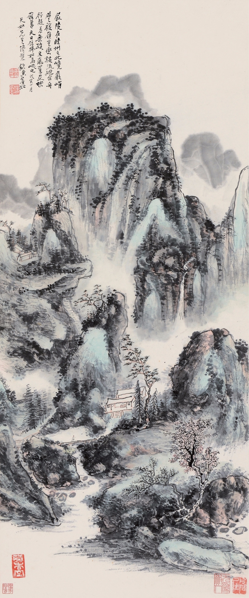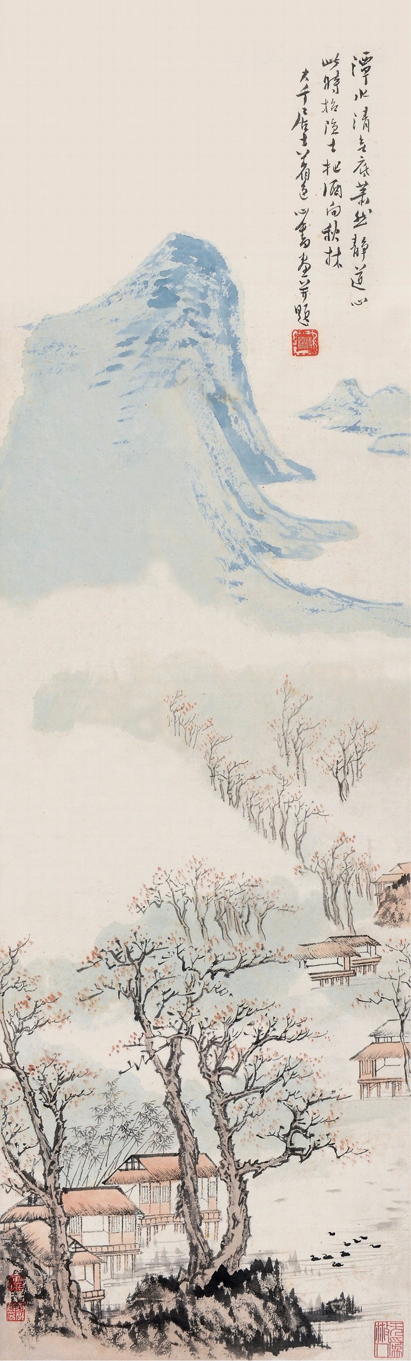 张稚琴,安徽无为人,青年时就读于上海光华大学,后于中央财政部任科长,抗战时期,任湖南保安司令部主任秘书。张稚琴从长沙时期起,便对兴办报业产生兴趣,曾任长沙《力报》总经理,后又主持筹办了著名的香港《文汇报》,并任总经理。因其女儿们的名字中都有个“秀”字,故名其寓为“揽秀楼”。 此幅张大千《揽秀楼图》为画家晚年为友人张稚琴所画,创作于1971年,张大千时年72岁,艺术之路一片坦途,他的画展相继在新加坡、吉隆坡和纽约等地举办,其作品在海内外颇受赞誉。是年四月,张大千由新加坡赴香港,北望神州,乡思万斛,对祖国的变迁大为惊叹。张大千赴港后,身为香港名流的张稚琴特邀其来家中做客。据张稚琴女儿回忆,此幅作品乃是张大千在他家案桌上当场写就。当时张大千共在张家绘制了两幅作品,而以此幅为精,画中一山头奇峰突起,苍翠凌空,山下屋宇井然,城墙绵延,虽用粗笔写意为之,但不失精细之处,笔势生发自如,用墨层次多变。全幅布局奇正互生,正合登高揽秀之意,是为大千酬赠好友的得心之作。 张稚琴收藏甚富,此次还有揽秀楼所藏的黄宾虹、溥儒的精品也一并推出。黄宾虹山水为唐天如赠予张稚琴,是二人友谊见证。“无为散人”为张稚琴收藏印。唐天如(1877—1961),字恩溥,广东新会人。得广东番禺收藏家潘仕成“听帆楼”旧额,因以为室名。少年举孝廉,后为国史馆总裁。历任广东高等学府教职。晚年移居香港,曾任香港红十字会会长。他工诗擅书,30年代与黄宾虹过从尤密,黄曾为唐天如绘听帆楼图三幅,均为黄氏精品。此轴布局繁密,以小青绿设色,林峦屋舍,层次井然,设色清润,较之黄氏晚年之作更多几分妍丽之姿。另有溥儒一画风格清新朗润,用笔柔而能健,峭而能刚,加以大千清雅的设色,南张北溥珠联璧合,也是不可多得的佳品。LOT 99 张大千 辛亥(1971)年作揽秀楼图 立轴 设色纸本 76×66.5cm估价 RMB 820,000-1,000,000 款识:揽秀楼图,辛亥二月朔,稚琴仁兄嘱写。蜀郡张大千爰。 印鉴:张爰之印、大千居士、可以居、一只眼 曾克端诗塘:揽秀楼。稚琴吾兄属,克端题。钤印:曾克端、涵贞楼。说明: 一、上款张稚琴,安徽无为人,青年时就读于上海光华大学,后于中央财政部任科长。抗战时期,任湖南保安司令部主任秘书,与张治中将军过往甚密。张稚琴从长沙时期起,便对兴办报业产生兴趣,曾任长沙《力报》总经理,后又主持筹办著名的香港《文汇报》。并任总经理。 二、直接得自上款人家属。LOT100 张大千 溥儒 秋林隐居 立轴设色纸本94×28.5cm估价 RMB 250,000-350,000 说明:“无为散人”为张稚琴收藏印。款识:潭水清无底,萧然静道心。此时招隐士,把酒向秋林。大千居士着色。心畬画并题。 印鉴:大千大利、蜀郡张爰、溥儒 鉴藏印:无为散人LOT 101 黄宾虹 戊寅(1938)年作 严陵秋景 屏轴 设色纸本74.5×31cm估价 RMB 720,000-1,000,000 说明:款识:严陵在睦州之北,巉严峭壁,复岭重峦,溪流回合,舟行疑若无路,且岚翠交映,蔽羃天日,仿佛如岛峡也。戊寅十月,天如先生博粲。歙黄宾虹。 印鉴:黄质私印、朴居士、片石居 鉴藏印:藤香室、揽秀楼、无为散人 一、唐天如(1877-1961)上款。字恩溥,广东兴会人,为翰林苑国史馆总裁,历任广东高等学府教职、吴佩孚秘书长,与梁启超、黄宾虹为挚交。且两人友谊至少在1925年前。精通医学,晚年移居香港行医,曾任香港红十字会会长。与张稚琴为好友,据家人回忆,此画乃唐转赠予张氏。 二、“揽秀楼”、“无为散人”为张稚琴收藏印。