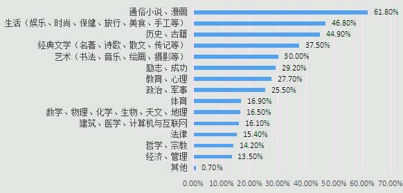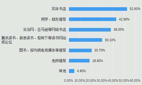 纸质书和电子书之争已持续了数年。前些年,电子书增长势头强劲,越来越多的人开始了电子阅读,业内外人士大都认为电子阅读是大势所趋,从而“唱衰”纸质书业;但近几年,国内外的电子书均出现了增长放缓、热度降低的情况,于是人们开始理性和深入地思考,观点出现了分化,还有部分媒体和学者对此做了实证研究,在事实基础上得出了较为客观的结论。 在相关的实证研究中,研究对象多为综合性群体,如某国国民、某市市民、某站网民等,他们在年龄、职业等方面存在诸多不同,由此得出的结论具有普遍性,但也因此缺乏对某一群体的细化研究,不利于出版社在选题策划时根据不同的受众找准定位。 高中生是当前重要的阅读群体之一,也是未来社会的主力军,他们的阅读情况在一定程度上能反映出当前青少年的阅读情况和未来阅读的趋势,具有较好的代表性和预测性。此次调查研究以高中生这一群体为研究对象,调查和分析他们目前纸质书和电子书的课外阅读情况,以期总结相关的结论和启示,为出版社今后更好地策划选题、谋求发展提供依据。 本次研究以问卷调查法为主要研究方法。为了使调查结果更具有普适性,选取福建福州市三所普通高中发放问卷,其中分布不同区的一、二、三级达标校各一所,使调查学校在质量层次和地区分布上相对均衡。并考虑到高一学生未文理分科,不利于细化研究,而高三学生学业较为紧张,过去一年的课外阅读可能较为有限,本研究选取了上述三所学校的高二学生作为问卷调查的对象,以随机抽样的方法在每所学校的高二年级分别抽取一个文科班和一个理科班,展开问卷调查,收集到的问卷数据采用SPSS22.0软件处理和分析。 本次问卷调查共回收问卷270份,其中有效问卷267份。在267份有效问卷中,一级达标校占34.8%,二级达标校占31.5%,三级达标校占33.7%;男生和女生的有效百分比分别为51.9%和48.1%;文科生和理科生的有效百分比分别为50.9%和49.1%。 (一)2016年福州市高中生中超过半数的学生阅读图书数量在10本以上,同时他们喜欢的图书类别依次是:通俗小说、漫画(61.8%),生活(娱乐、时尚、保健、旅行、美食、手工等)(46.8%),历史、古籍(44.9%),经典文学(37.5%),艺术(书法、音乐、绘画、摄影等)(30.0%)。 从高中生每天的课外阅读平均时长(详见图1)和过去一年里高中生阅读的课外图书数量(详见图2)来看,大部分学生保持着经常阅读的习惯,有半数左右的学生阅读图书数量在年均10本以上,几乎是每月1本。在课外阅读时长和图书数量上,男女生之间、文理科生之间均不存在显著性差异。图1 高中生每天的课外阅读平均时长 图2 2015年高中生课外图书阅读数量 关于高中生更喜欢阅读的图书类别,前五名依次是:通俗小说、漫画(61.8%),生活(娱乐、时尚、保健、旅行、美食、手工等)(46.8%),历史、古籍(44.9%),经典文学(37.5%),艺术(书法、音乐、绘画、摄影等)(30.0%)(详见图3)。可见高中生的阅读兴趣较为广泛,既有适合浅阅读的休闲类图书,也有适合深度阅读的学术类图书,但浅阅读类的图书类别居多。图3 高中生喜欢的图书类别(多选题) (二)实体书店是高中生获取图书信息的重要阵地,52.60%的高中生是通过实体书店获得图书信息。图4 高中生获取图书信息的途径(多选题) 高中生获取图书信息的主要途径是实体书店,同学、朋友推荐,当当网、亚马逊等网络书店等(详见图4)。实体书店作为高中生获取图书信息的首要途径,反映出在网络书店销量逐年攀升而实体书店生意日渐惨淡的情况下,实体书店仍然在高中生获取图书信息时占有重要的一席之地。 (三)高中生购买纸质书更喜欢去实体书店,通过网络购书时,则主要在淘宝网、当当网和亚马逊购买。 在调查中,有40.7%的学生主要通过“实体书店、书摊”购买图书,有30.8%的学生主要通过“网络”购书,有28.5%的学生表示“二者占比差不多”。可见,高中生购买纸质书更多是去实体店。就“网络”这条途径而言,高中生主要在淘宝网、当当网和亚马逊购买纸质书(详见图5)。其中,淘宝网作为并非专业性的售书网站,却与当当网并列第一,说明该网站对高中生的影响较大。图5 高中生购买纸质书的主要网站(多选题) (四)在过去的一年里,高中生阅读的电子书多于纸质书,其中30.1%的学生阅读纸质书明显多于电子书,50.4%的学生阅读电子书明显多于纸质书,并且,高中生喜欢电子阅读的比例高于成人任何一个年龄段喜欢电子阅读的比例。
