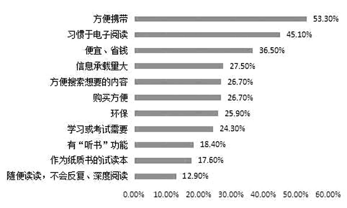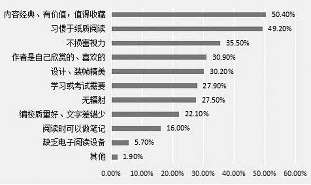 在过去的一年中,有30.1%的学生阅读的纸质书明显多于电子书,有50.4%的学生阅读的电子书明显多于纸质书,而有19.5%的学生阅读两种类型书的数量差不多,可见总体上高中生阅读的电子书数量多于纸质书。与此同时,有56.4%的学生表示自己更喜欢纸质阅读,有43.6%的学生表示自己更喜欢电子阅读。这一结果虽然显示出高中生中有更多人喜欢纸质阅读。但相比成年人,高中生喜欢电子阅读的比例高于成人任何一个年龄段喜欢电子阅读的比例。 在阅读方式偏好上,男生和女生存在非常显著的差异,即男生偏爱电子阅读,女生偏爱纸质阅读(详见表1)。不过,文理科生在阅读方式偏好上不存在显著性差异。 表1 性别与阅读方式偏好 (单位:人) 纸质阅读 电子阅读 男生 62 73 女生 87 41 总数 149 114 (五)在常用的电子阅读终端中,77.2%的高中生选择手机阅读,其次是iPad等平板电脑、kindle阅读器、PC端、其他,手机以绝对的优势成为了高中生最常用和最喜爱的电子阅读终端。 在高中生常用的电子阅读终端中,手机以85.2%的比例位居第一,接下来依次是iPad等平板电脑、PC端、Kindle阅读器、其他(详见图6、图7)。在相类似地高中生最喜欢的电子阅读终端是手机,这一选项占77.2%;接下来依次是iPad等平板电脑、Kindle阅读器、PC端、其他。调查发现,高中生对于Kindle阅读器的使用和喜爱程度,远不及他们对手机和iPad等平板电脑的使用和喜爱程度,即便是常用Kindle阅读器读书的学生中,也只有35.0%最爱Kindle阅读器,而有50.0%最爱手机、15.0%最爱iPad等平板电脑。由此可见,手机以绝对的优势成为了高中生最常用和最喜爱的电子阅读终端。图6 高中生常用的电子阅读终端(多选题)图7 高中生最爱的电子阅读终端 (六)关于一本书的纸质版本和电子版本,购买纸质版本的高中生55.1%不会再选择购买电子版本,而购买电子版本的高中生只有27.7%的学生选择不会购买纸质版本。由此说明,更多的学生还是倾向于购买纸质版本来反复阅读、保存或收藏自己喜欢的图书。图8 纸质书购买的原因(多选题) 高中生购买纸质书的前五位原因依次是:内容经典、有价值,值得收藏;习惯于纸质阅读;不损害视力;作者是自己欣赏的、喜欢的;设计、装帧精美(详见图8)。其中,“习惯于纸质阅读”排在第二位,有近一半的学生选它,说明有接近半数的学生仍然习惯或喜欢传统的纸质阅读方式。“内容经典、有价值,值得收藏”和“作者是自己欣赏的、喜欢的”再次证实了“内容质量”和“作者”是高中生选购纸质图书时非常注重的因素。“设计、装帧精美”则反映了高中生除注重图书的内容实质以外,也欣赏、品味图书的装帧设计。 而回答自己购买电子书的原因时,高中生选择的前五位原因依次是:方便携带,习惯于电子阅读,便宜、省钱,信息承载量大,购买方便,方便搜索想要的内容,其中最后两个原因并列第五(详见图9)。其中,“习惯于电子阅读”位居第二,有接近半数的学生选择,这说明部分高中生习惯甚至偏爱电子阅读。图9 购买电子书的原因(多选) 在回答“在购买纸质书后,你是否会再购买该书的电子书”时,有16.7%的学生选择“会”,有28.1%的学生选择“有时会”,有55.1%的学生选择“不会”。可见大部分高中生在购买纸质书后不会再购买该种电子书。 在回答“在购买电子书后,你是否会再购买该种纸质书”时,有28.8%的学生选择“会”,有43.5%的学生选择“有时会”,有27.7%的学生选择“不会”。这里“会”和“有时会”的比例均高于上述“购买纸质书后是否会选择购买该种电子书”的比例,说明相较于电子版本,更多的学生还是倾向于购买纸质版本来反复阅读、保存或收藏自己喜欢的图书。 (七)高中生电子阅读完成率略高于纸质阅读。35.0%的学生表示他们纸质阅读的完成率更高,有38.9%的学生表示他们电子阅读的完成率更高。 在阅读完成率方面,有35.0%的学生表示他们纸质阅读的完成率更高,有38.9%的学生表示他们电子阅读的完成率更高,有26.1%的学生表示二者完成率差异不大。阅读完成率与阅读方式偏好有直接关系:偏爱纸质阅读的学生在阅读纸质书时完成率更高,偏爱电子阅读的学生在阅读电子书时完成率更高(详见表2和表3)。这些结果再次从侧面说明,人们的阅读习惯在发生改变和分化,喜欢和习惯于电子阅读的读者在增多,同时喜欢和习惯于纸质阅读的读者也仍然大有人在,他们的阅读完成率多取决于他们的阅读方式偏好和习惯,而与阅读内容、性质等没有太直接的关系。