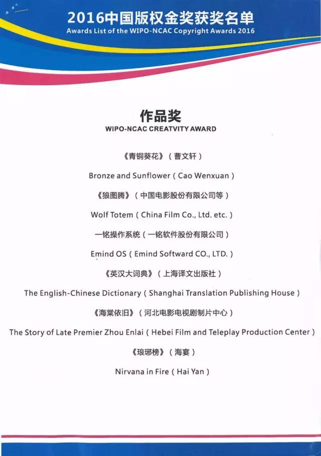 12月5日上午,在广州举行的第六届中国国际版权博览会开幕式暨中国版权金奖颁奖会议上,上海译文出版社出版的《英汉大词典》文字作品,被授予“2016年中国版权金奖”。本届版权金奖共有6个项目荣获“作品奖”,《英汉大词典》名列其中。作品奖的参评标准是,具有自主创新精神,创作方式和内容形式富有创新性,思想内容积极向上,经济价值高,传播范围广,社会认知度高,具有显著经济效益和社会效益,有一定市场占有率,对经济发展贡献比较明显的作品。作品奖分为文学艺术、电影电视、音乐戏剧、计算机软件、动漫游戏、美术摄影等门类。 |