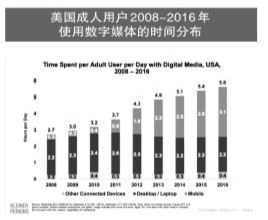 从2008年到2016年,美国成年人每天使用数字媒体的时间增长了超过1倍,其中使用移动设备的时间从0.3小时增至3.1小时,而使用电脑和其他联网设备的时间几乎没有变化。由此可以看出,移动设备已成为消费者使用数字平台的主要方式。