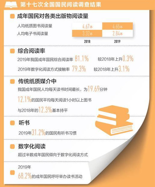 第十七次全民阅读调查显示,2019年我国成年国民各媒介综合阅读率保持增长势头,但纸质图书和电子书的阅读量有所下降。手机和互联网成为我国成年国民接触媒介的主体,有声阅读继续较快增长,听书成为读书人的新选择。近七成成年国民希望,全民阅读活动再多一些。