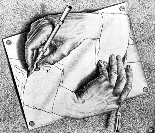 如果一只手在画另一只手,同时,被画的那只手又忙着画第一只手,而所有这一切又都画在一张被图钉固定在画板上的纸面上……又如果这一切都是画出来的,我们就可以把它称为超级骗术。