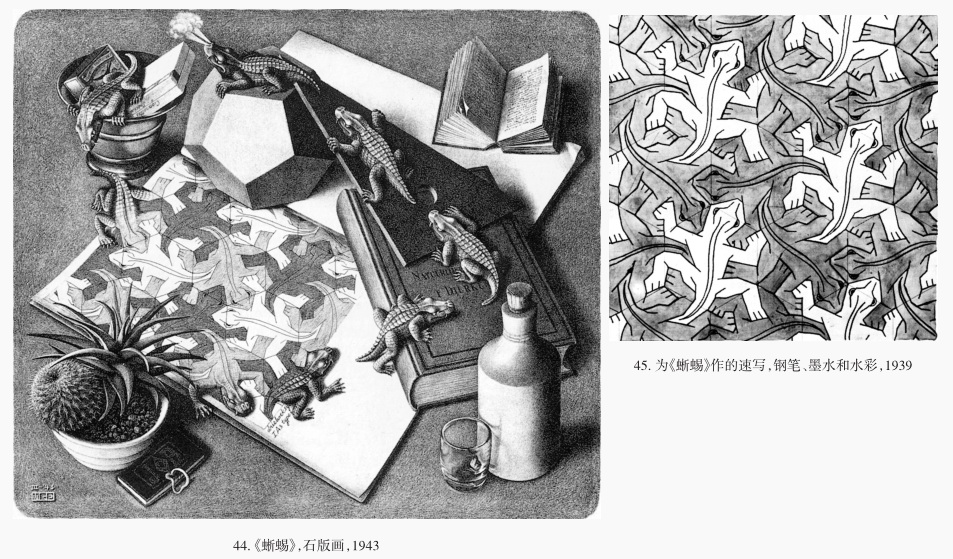 在石版画《蜥蜴》(1943)中,我们看到了表现埃舍尔周期性图案思想的速写本。在左下侧的边缘,一些小小的、扁平的速写图形开始生出奇妙的第三维,进而从速写本中爬了出来。这只蜥蜴爬过一部动物学著作,爬过一块三角板,最后爬到一个十二面体的顶上;它打了个胜利的响鼻,鼻孔里还喷了些烟。但是游戏结束了,所以它从铜钵又跳回到速写本上。它回缩成一个图形,被正三角形网格牢牢锁定。