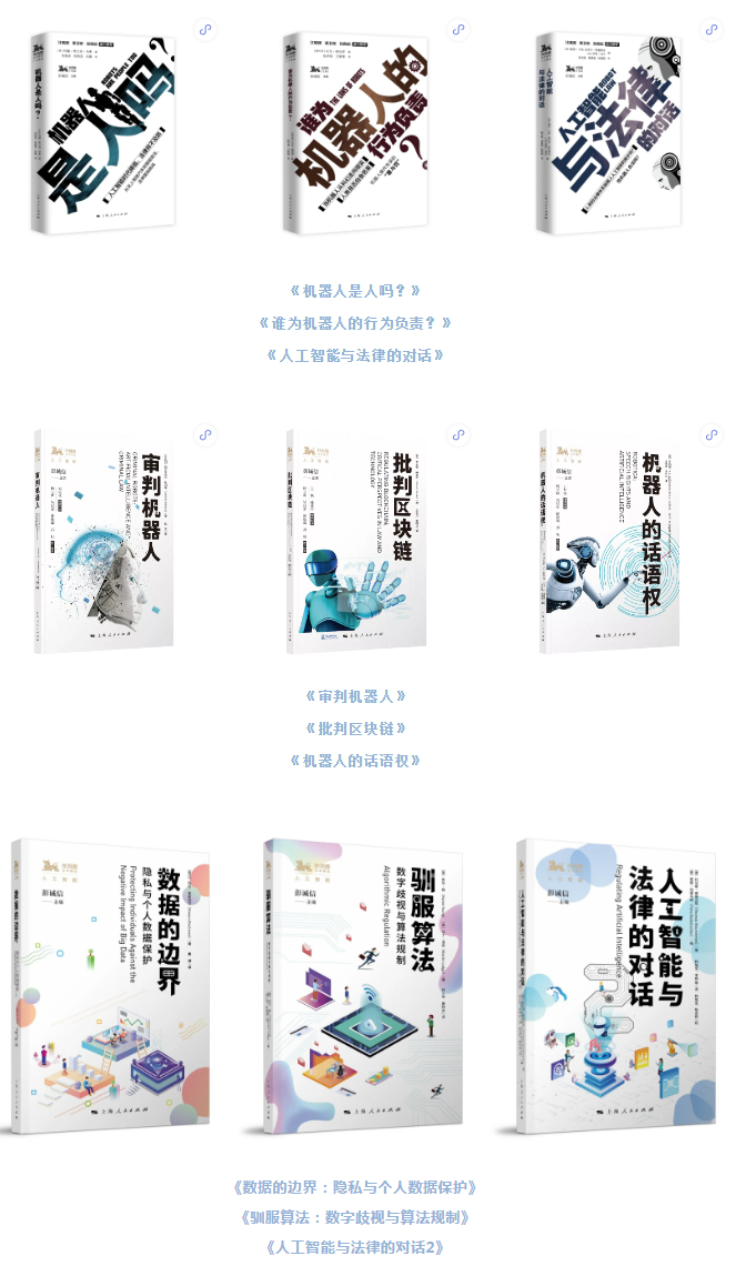 上海人民出版社自2018年以来已经连续三年推出人工智能与法律领域的系列图书——“独角兽法学精品·人工智能”丛书(彭诚信主编),该套丛书包括人工智能、大数据、区块链、算法等与法律交叉领域的最新学术前沿内容。