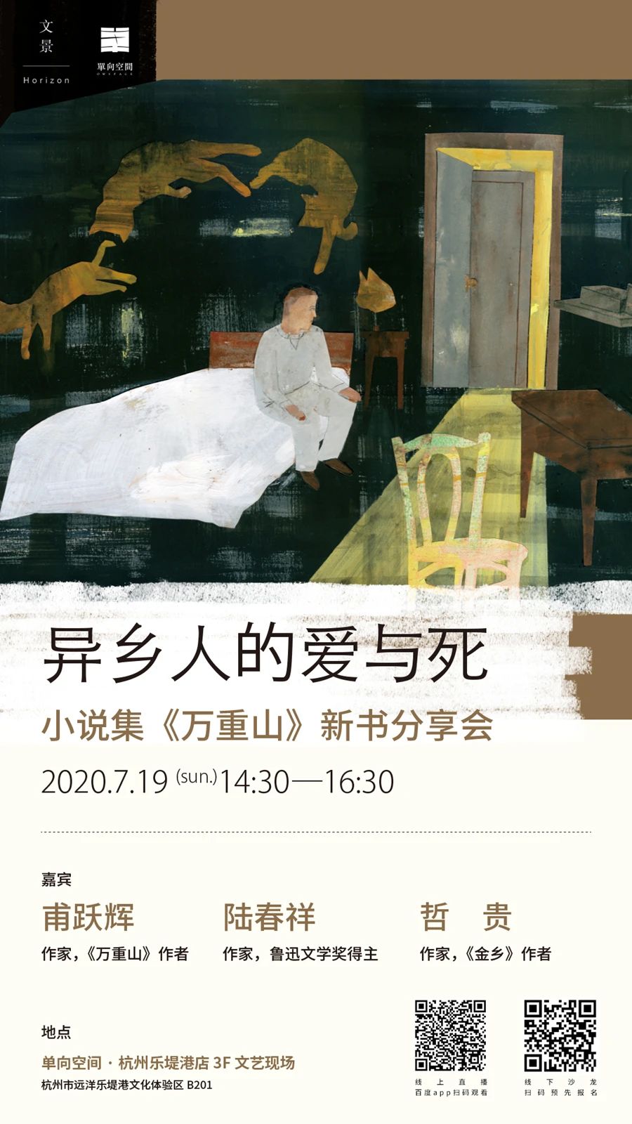 当代都市异乡人体验着生活方式的剧变。大都市作为欲望的载体,提供给人们优化生活的机会,也为人们带来了被异化的风险。 作家甫跃辉来自云南边疆的保山市施甸县,2003年参加高考考到复旦大学,后来就一直留在上海。边疆乡村与现代化大都市间巨大的差异对他有强烈的冲击力。处在对比状态中,家乡的很多东西被他“重新发现”,从而影响他的写作。 在甫跃辉最新出版的小说集《万重山》中,他以从乡村来到大都市的青年学生、知识分子为主角,围绕他们的爱与死、恐惧和孤独,记录其内心的成长与挣扎。本次活动甫跃辉将与作家陆春祥、哲贵一起为读者分享这个时代作为“异乡人”的体验,以及这种体验对文学创作的影响。异乡人的爱与死——小说集《万重山》新书分享会 嘉宾:甫跃辉、陆春祥、哲贵 时间:2020年7月19日(周日)14:30-16:30 地点:单向空间·杭州乐堤港店1F(杭州市远洋乐堤港文化体验区 B103) 主办方:世纪文景、单向空间参与方式:嘉宾介绍 甫跃辉 1984年生,云南施甸人,现居上海。出版小说集《少年游》《动物园》《鱼王》《散佚的族谱》《每一间房舍都是一座烛台》《安娜的火车》《万重山》,长篇小说《刻舟记》等。 陆春祥 笔名陆布衣等,一级作家,浙江省作协副主席,浙江省散文学会会长,已出散文随笔集《字字锦》《笔记的笔记》《连山》《而已》《袖中锦》《九万里风》等二十余种,主编浙江散文精选、风起江南散文系列等二十六种,作品曾获第五届鲁迅文学奖、北京文学奖、浙江省优秀文学作品奖、上海市优秀文学作品奖、中国报纸副刊作品金奖等。 哲贵 作家,浙江温州人,1973年生。一级作家,浙江省作家协会副主席。已出版小说《猛虎图》《金属心》《信河街传奇》《某某人》《我对这个时代有话要说》,非虚构作品《金乡》等。曾获《十月》文学奖、《作家》金短篇奖、郁达夫短篇小说奖等。作品主要探讨富人群体的生活方式及其精神裂变,以及他们与这个时代的微妙关系。相关图书《万重山》甫跃辉 著上海人民出版社 世纪文景李敬泽、何平、阿乙 一致推荐郁达夫小说奖、“紫金人民文学之星”短篇小说创作奖、十月文学奖得主新作 从童年、青年到暮年,从父辈到同辈,《万重山》写尽人生的种种现实与虚妄。也许你曾是少年,你有过梦想,梦醒时分,有人投降,有人假寐,有人把灵魂交给魔鬼,而你当去往何方? 从乡村到都市,《万重山》记录一代外省青年的成长挣扎。甫跃辉笔下的主人公多是从农村到上海求学、谋生。随着经历考大学、找工作等人生节点,他们体验着生活方式的剧变。大都市作为欲望的载体,提供给他们优化生活的机会,也为他们带来了被异化的风险。