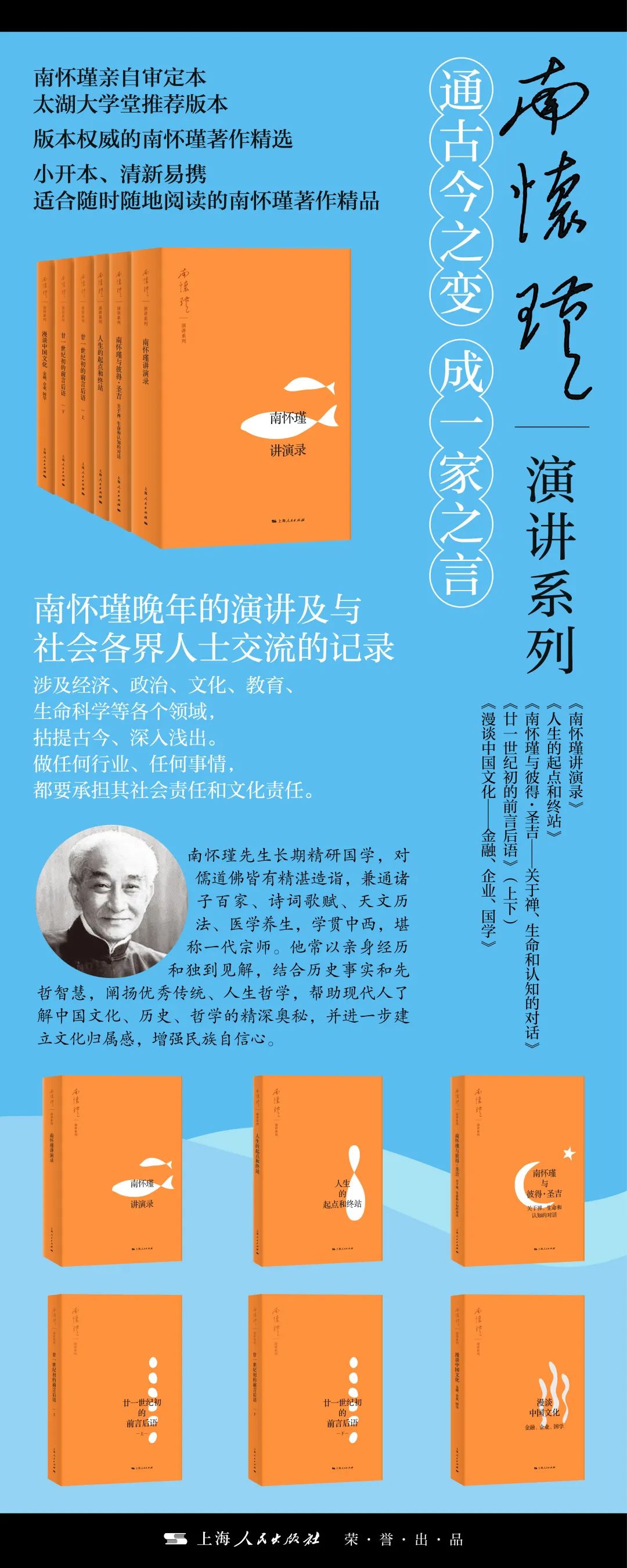 2020年8月15日上午,经过全新打造的“南怀演讲系列”在上海书展首发,本系列包括《南怀瑾讲演录》《人生的起点和终站》《南怀瑾与彼得·圣吉》《廿一世纪初的前言后语》《漫谈中国文化——金融、企业、国学》5种,是南怀瑾晚年演讲和与社会各界人士交流的记录,话题涉及经济、政治、文化、教育、生命科学等各个领域。沿袭其拈提古今、深入浅出的一贯风格,讲演内容看似天马行空,但无一不是在强调做任何行业、任何事情,都要承担其社会责任和文化责任。