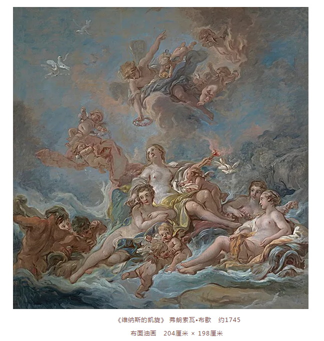 首先,在18世纪的作品中,我选取了3位画家的3件作品。第一件是弗朗索瓦·布歇的《维纳斯的凯旋》。这幅画原为英国著名藏家理查德·华莱士爵士(Sir Richard Wallace,1818-1890)收藏,曾挂在他位于巴黎布洛纽森林宅邸巴格特尔宫(Chateau de Bagatelle)中。20世纪初,这幅画转入品味高雅的藏家罗斯柴尔德男爵(Baron Rothschild)手中。华莱士和罗斯柴尔德男爵都是洛可可艺术的大藏家,这幅画的形象也因此愈发优雅。华莱士爵士收藏的优美俊逸的洛可可绘画,现在伦敦的华莱士画廊中公开展出。因展品不能外借,所以不去现场便无法一睹真容,着实遗憾。