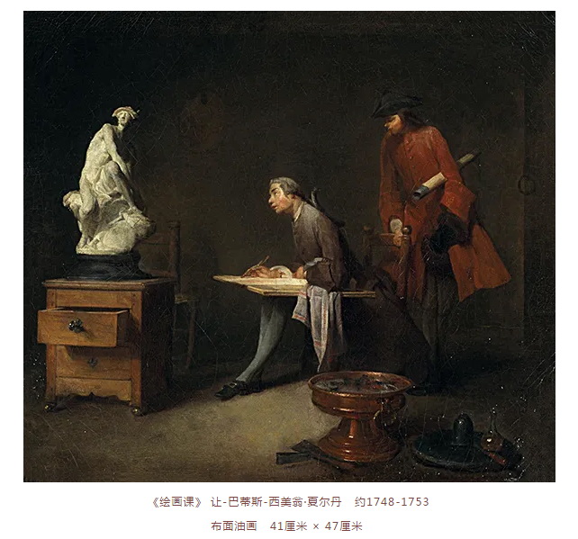 第二幅是夏尔丹的《绘画课》。这幅画曾展出于1753年沙龙,与现在藏于美国休斯顿美术馆收藏的《良好教育》并称双璧。这幅作品,是应18世纪伟大的收藏家安杰·洛朗·拉利夫·德·朱利(angelaurent La Live de Jully,1725-1779)的委托而创作的。1979年,巴黎格兰帕雷“夏尔丹展”的学术总监皮埃尔·洛桑贝尔(Pierre Rosenberg)讲述了这幅作品的来历: