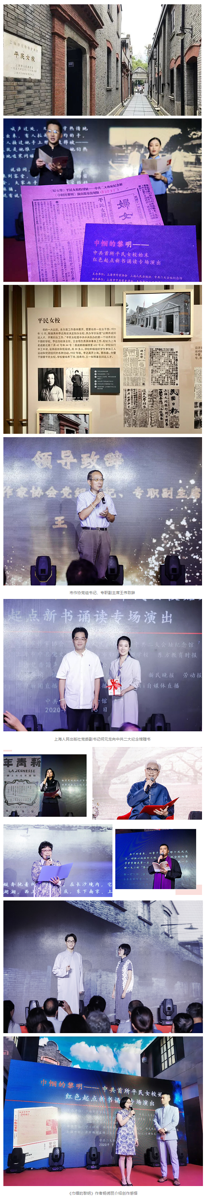 2020年9月16日下午,《巾帼的黎明——中共首所平民女校始末》红色起点新书诵读专场演出在中共二大纪念馆里举行,基于作家杨绣丽创作的《巾帼的黎明》节选文本,邀请多位艺术家进行二度创作演绎,并结合多媒体制作、黑白老照片展示和配乐铺陈,生动展示了中共首所平民女校的感人故事和女性精神。