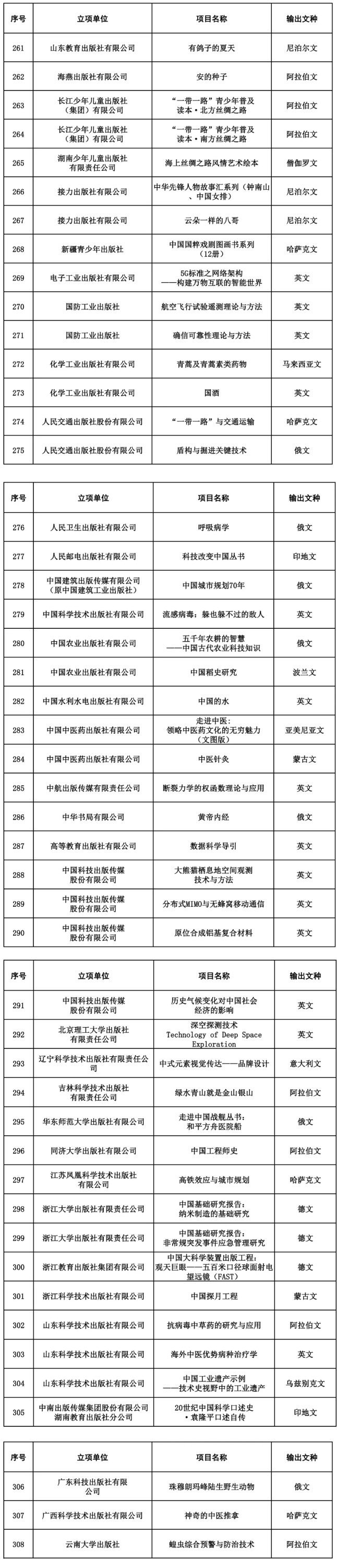 2020年4月,丝路书香工程办公室启动本年度项目申报工作。在对项目版权归属、申报要件等审核,组织专家初评、复评和终评,并对内容审核把关基础上,确定131家出版机构308种图书为本年度资助项目。现将名单予以公示,接受社会监督。 本公示自2020年9月28日至10月4日,时间为7天。在此期间,凡对所列单位、项目存有异议,请将意见反馈至丝路书香工程秘书处。 联系人:王雯 010-52257061 电子邮箱:silufy@163.com 丝路书香工程办公室 2020年9月28日