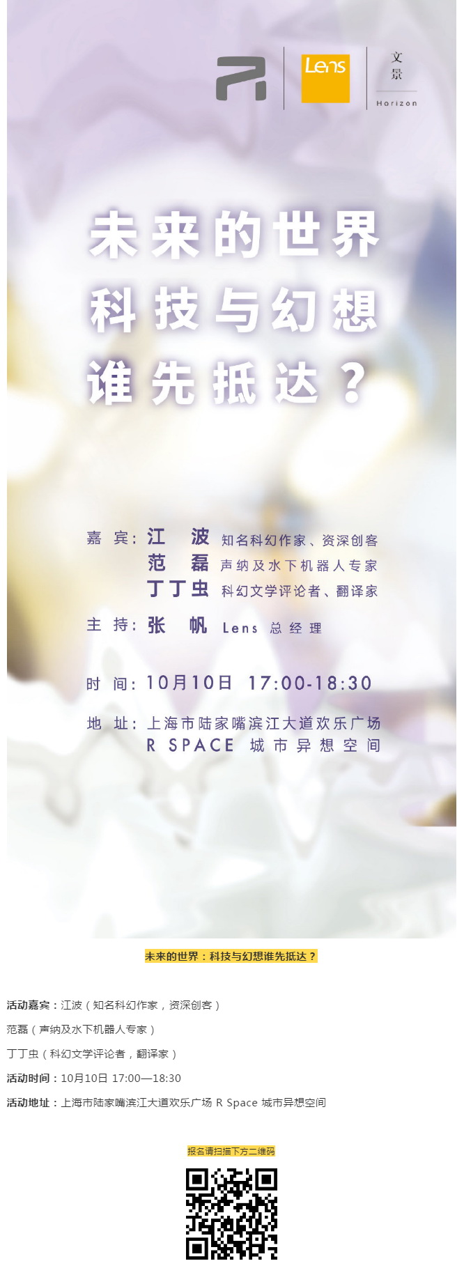 本周六(2020年10月10日)下午,世纪文景联合Lens邀请科幻作家江波、科幻文学译者丁丁虫、声纳及水下机器人专家范磊 ,在R汽车的魔都新地标R Space一起聊聊:未来的世界:科技与幻想谁先抵达?