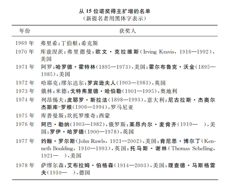 简单的算术可以证明,在头十年里(1969—1978年),瑞典皇家科学院本可以给出一个30人的名单,而不是仅仅嘉奖我们这15位经济学家。基于好奇和公平公正,我再提一个15人的应获奖者的名单,作为反事实的思维实验。每位读者可以像我一样,随机地在50名公认的杰出人物中挑选15人,来替代我从1500个名单中挑出的这15人。
