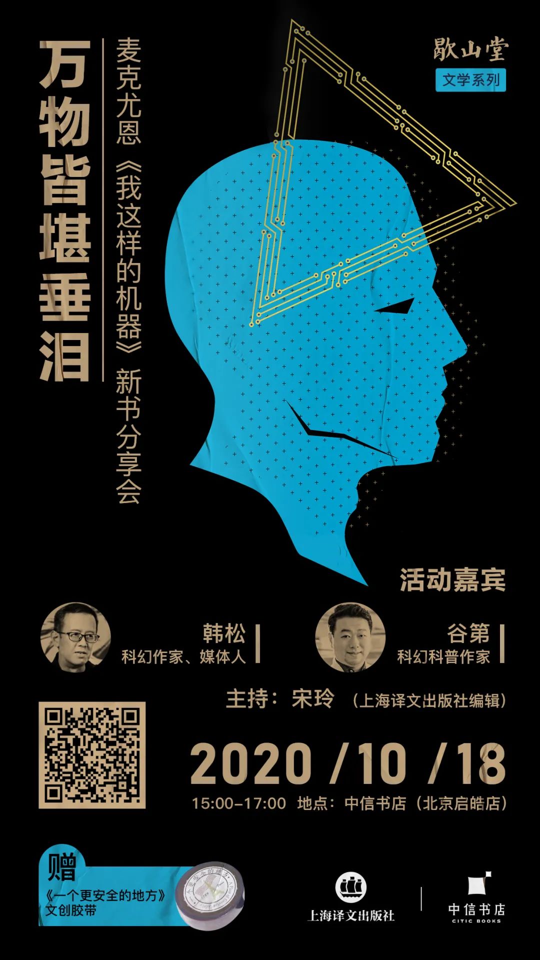 2020年10月18日(周日)15:00~17:00,上海译文出版社邀请两位著名的科幻作家——韩松与谷第,一同来到中信书店启皓店,围绕麦克尤恩的新作品《我这样的机器》,聊聊文学中的人工智能这个话题。