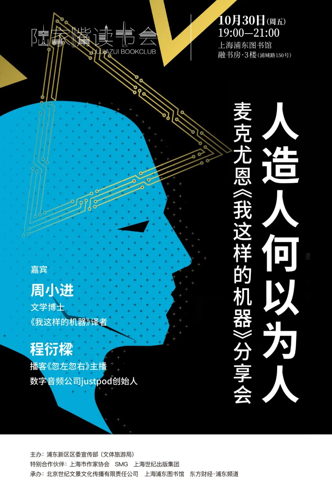 2020年,人工智能的发展突飞猛进,已逐渐深入人类的日常生活,人们对AI技术、人工智能、机器人、仿生人等名词已不再陌生。 英国作家伊恩·麦克尤恩紧盯时代发展的前沿,将这一热门话题与自己最擅长的“道德困境”主题结合在一起,试图在文学作品中为全人类前瞻地讨论一些深刻的伦理问题。 他在《我这样的机器》中写道:“我们创造了一种有智能、有自我意识的机器,并将其推入我们这个不完美的世界。” 由人类发明、设定参数的机器人在为人类服务的同时,又卷入了人类的情感冲突和矛盾之中。人造人与人类之间的界限该如何界定? 如果你也对这个问题感兴趣或者有疑问,不妨来“人造人何以为人——麦克尤恩《我这样的机器》分享会”,听听嘉宾们都是怎么说的。 2020年10月30日(周五)19:00~21:00,陆家嘴读书会邀请文学博士、《我这样的机器》译者周小进和播客《忽左忽右》主播、JustPod创始人程衍樑,就麦克尤恩的新作《我这样的机器》,探讨一下最近几年严肃文学作家们对人工智能这一当代热门话题的观察、设想与创作。活动时间2020年10月30日(周五) 19:00-21:00活动地点上海浦东图书馆·融书房浦东区浦城路150号3楼嘉宾简介 周小进,《我这样的机器》译者 上海对外经贸大学副教授,文学博士。著有《从滞定到流动——托马斯·基尼利小说中的身份主题》;译有乔伊斯·卡罗尔·欧茨、托马斯·基尼利、霍华德·雅各布森、多丽丝·莱辛、石黑一雄、伊恩·麦克尤恩等英语现当代名家作品多部。 程衍樑,《忽左忽右》主播 播客《忽左忽右》主播、JustPod创始人。前媒体人,长期从事文化报道工作。2018年创办中文播客《忽左忽右》,同年创办数字音频公司JustPod并担任CEO,为更多机构品牌提供播客内容制作服务。主办单位浦东新区区委宣传部(文体旅游局)特别合作单位上海市作家协会SMG上海世纪出版集团上海译文出版社承办单位北京世纪文景文化传播有限责任公司上海浦东图书馆东方财经·浦东频道Machines Like Me《我这样的机器》[英]伊恩·麦克尤恩 著周小进 译上海译文出版社 1982年,平行世界的英国伦敦,彼时人工智能研究已经远远超过了我们当前的发展水平。在撒切尔夫人的领导下,英国在马岛战争中落败,举国哗然之际托尼?本恩当选为英国首相。“人工智能之父”图灵也没有自杀,麦克尤恩给了图灵他应得的生命,而非受到审判、监禁、自杀。图灵得享高寿,活在世人的尊崇之中,他的作品创造了技术奇迹。 与此同时,32岁的伦敦人查理开始了两段新的关系:一,他爱上了楼上的邻居米兰达;二,他用继承的遗产购买了一款新型人形机器人“亚当”。“亚当”拥有以假乱真的智能和外观,能够完成逼真又不失自然的动作和表情变化。在米兰达的帮助下,查理重塑了“亚当”的性格,于是一组奇怪的三角关系渐渐形成……事情也慢慢开始失控。 麦克尤恩在小说中探讨了人类与人工智能的区别,究竟是什么使我们成为人类——我们外在的行为还是内在的生命?机器人能够明白人类的心吗?对于那些人类无法掌控的技术,这部小说将带给读者深入的思考。