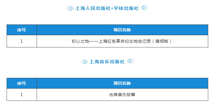 根据《国家新闻出版署关于申报2020年全国有声读物精品出版工程项目的通知》,经工程评审办公室组织专家严格评审遴选,共55种出版物入选全国有声读物精品出版工程入选名单。其中,上海世纪出版集团旗下上海人民出版社·学林出版社和上海音乐出版社各1种入选。