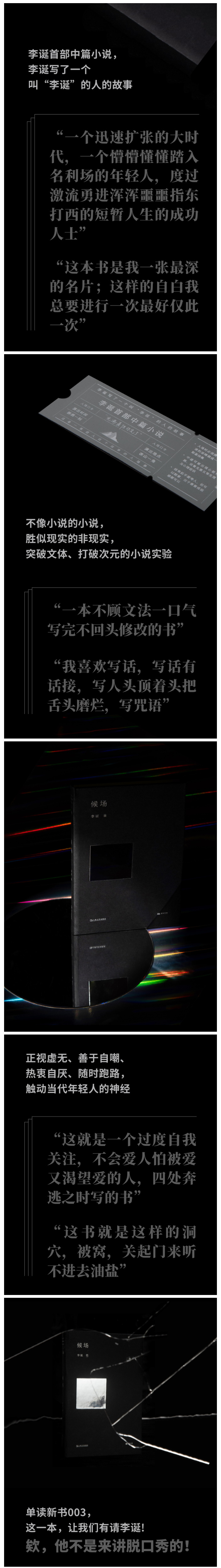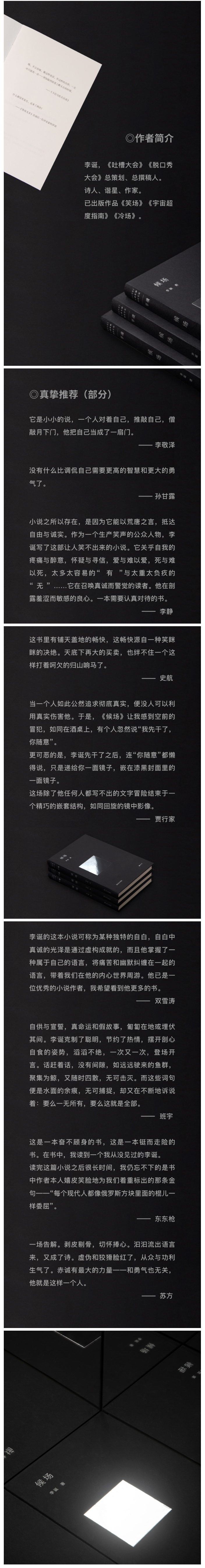 今年年初,李诞在家待了一阵,早上6点钟睡不着觉开始写,每天写个三五千字,如此一个月。《候场》就这么写成了。 李诞一直在写作这件事,没有他做脱口秀这么为人所知。而出版李诞的首部中篇小说,有很多机缘,最重要的原因还是来自我们的共识——文学首先来自自身深处,在经历社会的摩擦和试炼后,才获得人形。它只关于人如何诚实地面对自我,并且不羞于说出这种面对。 《候场》不是一个脱口秀演员的自传,它是一部小说,关乎自我与世界的关系。我们期待它能够冲破标签,跟更多的朋友相遇,在一个更加坦诚、宽阔和富有生命力的文学世界里,获得自由。 李诞在《候场》里营造了一种非常奇妙的时间感,他解释说,“时间是不存在的,你行动才有时间”。而在文学的世界里,“你阅读才有时间”。 候场已久,各位久等。 这一本,有请李诞!《候场》李诞 著上海文艺出版社2020年11月