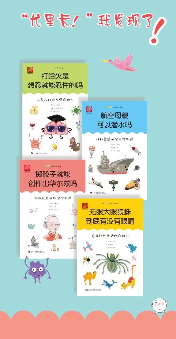 《无眼大眼狼蛛到底有没有眼睛》 施鹤群/著 李梦雪/插图 《掷骰子就能创作出华尔兹吗》 张晓红/著 宫世杰/插图 《打哈欠是想忍就能忍住的吗》 张晓红 施鹤群/著 李田/插图 《航空母舰可以潜水吗》 施鹤群/著 李田/插图 上海科技教育出版社 2019年8月