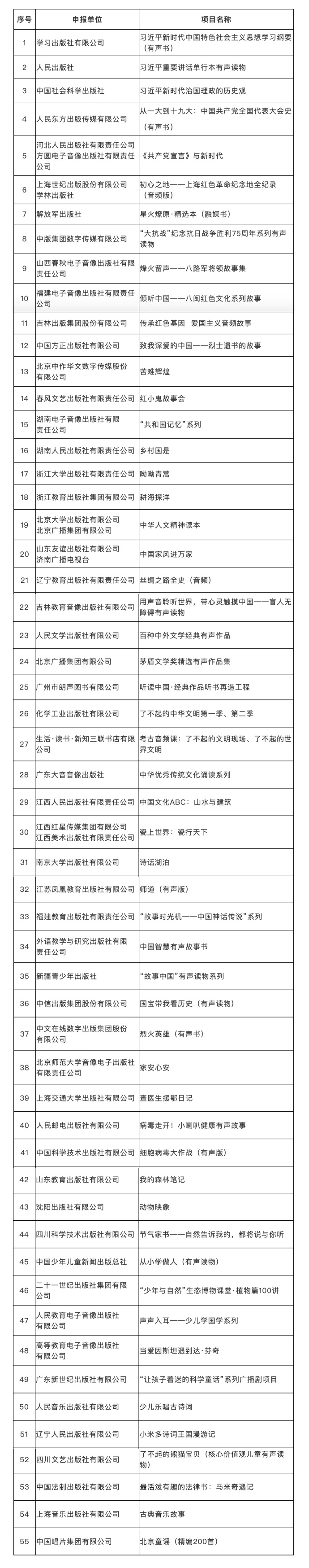 (其中上海入选项目包括:上海世纪出版股份有限公司学林出版社的“初心之地——上海红色革命纪念地全纪录(音频版)”、上海交通大学出版社有限公司的“查医生援鄂日记”、上海音乐出版社有限公司的“古典音乐故事”。)