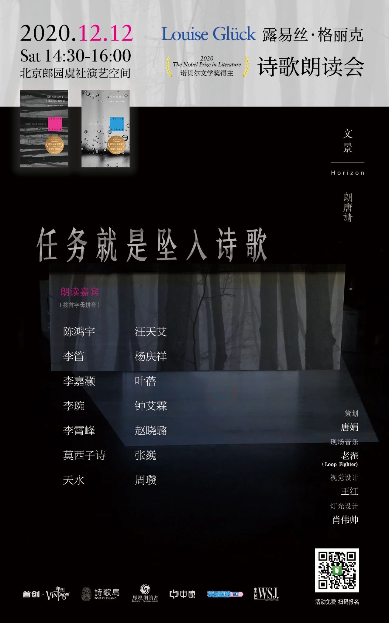 也许,你们会在这些旅途中发现一种你们理解不了的完整——正如男男女女,你们从未能自在地将精神留下的任何印记刻录到身体里。——露易丝·格丽克《蚯蚓》 露易丝·格丽克被授予2020年诺贝尔文学奖,授奖词如是说:“她精准的诗意语言所营造的冷峻之美,让个体的存在具有普遍性。”格丽克很小的时候就展露了诗歌天赋,五六岁的时候已经开始写诗,从十多岁开始,她就在内心明确地希望自己成为一个诗人。到如今,格丽克已经写了五十年。世纪文景策划出品的“沉默的经典”诗歌译丛,于2016年推出了露易丝·格丽克的两本诗集《月光的合金》《直到世界反映了灵魂最深层的需要》,这位在世界诗坛享誉已久的诗人,因此首度进入中国读者的视野,随着2020诺贝尔奖带来的名人效应,会有更多人走入格丽克的诗歌世界,成为她的读者。 2020年12月12日下午,露易丝·格丽克的诗歌朗读会将在北京郎园vintage虞社演艺空间举办。朗读会由世纪文景联合朗唐请策划人唐娟共同呈现,并得到了联合主办方诗歌岛、凤凰读书、三联中读的大力支持。现场将有来自音乐、文学、电影、科技、戏剧、艺术等众多不同领域的嘉宾们,为大家朗读格丽克的诗。这将是一场特别的文本体验现场。以露易丝·格丽克的诗歌为中心点,在富于光影的剧场空间内建构视觉、听觉,与文本的朗读紧密融合,富于逻辑又充满变化地呈现格丽克诗歌的特点和魅力。任务就是坠入诗歌 露易丝·格丽克诗歌朗读会 活动信息■ 时间:2020年12月12日 14:30—16:00■ 地点:北京郎园vintage 虞社演艺空间■ 策划人:唐娟■ 现场音乐:老翟(Loop Fighter)■ 视觉设计:王江■ 灯光设计:肖伟帅■ 主办:世纪文景、朗唐请、郎园vintage■ 联合主办:诗歌岛、凤凰读书■ 媒体支持:三联中读、出色WSJ中文版如何参与 1、本次活动免费。读者请扫码提前报名,现场凭一本格丽克诗集入场。 2、现场将开放上台朗读机会给读者。请希望参加朗读的读者报名提交申请,我们将筛选4位,活动3天前电话通知。形式呈现朗读+解说+表演+音乐演奏文本内容 以露易丝·格丽克两本诗集《月光的合金》《直到世界反映了灵魂最深层的需要》为主,辅助以格丽克诗论随笔片段,以及对格丽克诗歌艺术的适当解说。朗读与演绎 将穿行在格丽克诗集中的神话故事线,与格丽克不同风格的诗歌交织。将专业演员的扮演性朗读,与朗读嘉宾和现场读者的朗读有机融合。 现场音乐 由极具才华的年轻独立音乐人老翟为朗读内容编创音乐并现场演奏。 如同格丽克在诗中所言:“任务是坠入爱情。/作者是女性。/自我必须被称为灵魂。”而我们等着你来,进入这个现场,任务就是坠入诗歌,坠入露易丝·格丽克,享受这个下午。嘉宾介绍(以下名单按拼音首字母排序)陈鸿宇独立音乐人,众乐纪&众方纪创始人代表作:《理想三旬》《一如年少模样》等。李笛微软小冰之父,小冰公司CEO。李嘉灏青年演员。李琬诗人,文学编辑。李霄峰电影导演代表作:《风平浪静》《少女哪吒》等。莫西子诗歌手,音乐人代表作:《阿皆咯》《要死就一定要死在你手里》等。天水策展人,诗歌岛策划人。汪天艾青年译者译著代表作:《奥克诺斯》《夜的命名术》《帝国游戏》等。杨庆祥诗人,批评家代表作:《80后,怎么办?》《我选择哭泣和爱你》等。叶蓓歌手,音乐人代表作:《白衣飘飘的年代》《B小调雨后》等。钟艾霖青年演员。赵晓璐戏剧工作者。张巍舞台剧演员戏剧作品:《水流下来》《李鸿章对话伊藤博文》等。周瓒诗人、批评家代表作:《哪吒的另一重生活》《透过诗歌写作的潜望镜》等。策划人唐娟文学现场策划人朗唐请工作室创办人现场音乐老翟独立音乐人Loop Fighter主脑人间指南乐队吉他&主唱视觉设计王江独立设计师灯光设计肖伟帅灯光设计师相关推荐格丽克作品集 《月光的合金》《直到世界反映了灵魂最深层的需要》“她精准的诗意语言所营造的朴素之美让个体的存在具有普遍性。”这是格丽克代表诗作首度引进“不需要诗歌的年代”更需要伟大的诗歌“沉默的经典”诗歌译丛权威译本,精致典藏